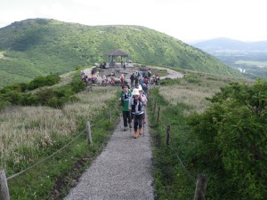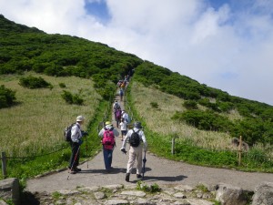 2013年6月16日(日) 天気 曇り時々晴れ ■出発時間:午前5時40分(自宅) ■メンバー:娘夫婦と家内と私の4名 梅雨の合間の晴れ間、今日は先月に引き続き娘夫婦と山に出かけることになり、今年初のミヤマキリシマの花を拝みに九重に足を運んだ。 牧ノ戸峠は予想通り大混雑で予測して早出をしたが、それでも遅かった。仕方なく猟師山登山口の駐車スペースに車を停め車道を牧ノ戸峠まで歩いた。 きれいに建て替えられたゲストハウスではたくさんの登山者が出発準備をしていて昨年の登山道渋滞を思い浮かべてしまった。 しかし、悪い予想は運よくはずれ、沓掛山も混雑したものの無事通過した。ミヤマキリシマはやや遅い気がするが、咲いていてくれてホッとする。 稜線はところどころガスが覆ってきて大パノラマを遮ってしまうが、午前中は持ちこたえそうである。扇ケ鼻分岐よりUターン気味に頂上を目指す。 ふと前方に懐かしい姿、さこちゃんご夫妻である。少しの間、立ち話をするが一緒に歩いた頃がとても懐かしく、また会える日を楽しみにお別れをする。 急登としてなだらかな稜線に出る。マイヅルソウがガスに揺れ瑞々しい。ミヤマキリシマの花は虫に食べらてしまったようでピンクで染まるはずの稜線を残念ながら今回は拝むことはできなかった。山頂に着くとガスが覆ってきて展望が利かない。この時期特有の現象なので止む得ない。頂上の先でランチタイムをとることに。 しばらくすると陽が差してきて帽子を脱いだ私の頭に直撃してとても暑い。開けた下界を見るとなんだか映画のワンシーンのように見える。 時々、陽は差すものの頂上付近のガスは抜けず、諦めて下山を始める。それにしても最近は若者が多くなり、華やかである。それに若い夫婦の子供連れも多い。十分、周りが気をつけてあげることが肝要であると感じる。 第二展望台で一休みしようとすると「また会える日を楽しみに・・・」と思っていたさこちゃんご夫婦に再会できる。 無事に下山した私たちは、その後、スキー場側から猟師山の麓まで林道を歩き、オオヤマレンゲの花を見に行った。わずかに開花した白い花は何度見ても華麗である。 今日も自然に山に出合った人に感謝! |