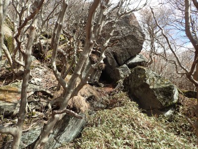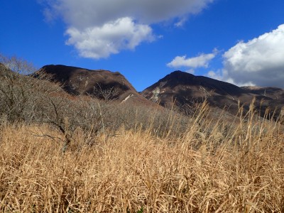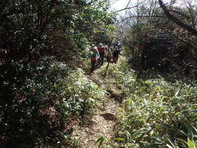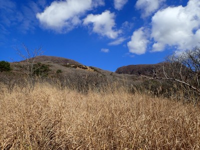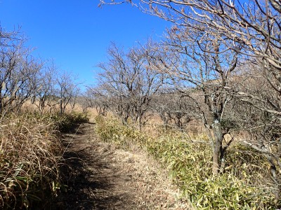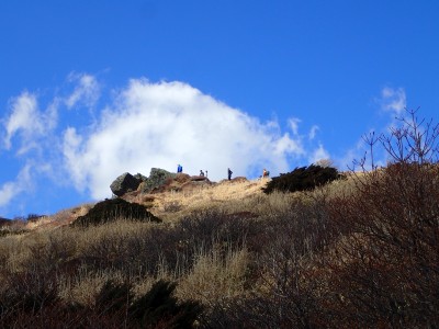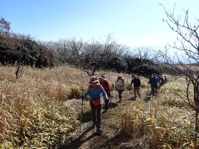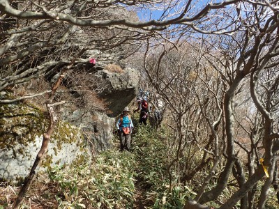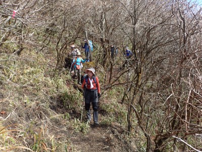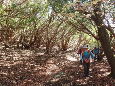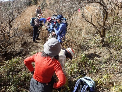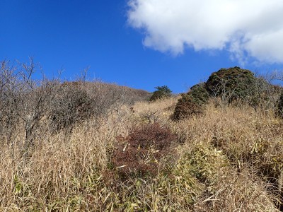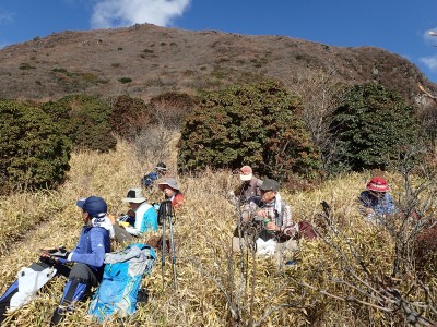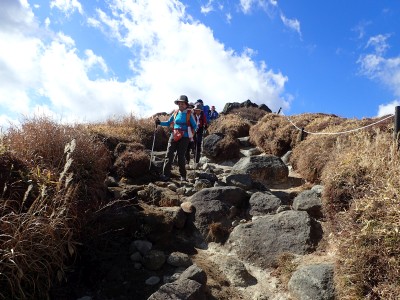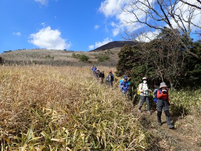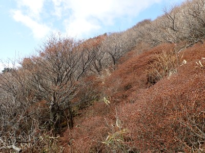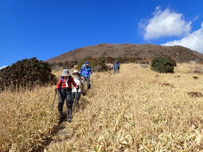さて今回のルートだが、下見では扇ケ鼻から久住山を周り赤川へと戻る周回コースであったが、今年の集中雨で久住山への直登ルートは整備したにも関わらず崩れたらしい。それもあるし、このコロナ禍でメンバーの体力が落ちていることを考えると周回は厳しいので扇ケ鼻をピストンすることにした。駐車場を出発してわずかに残った紅葉は希少価値があるかのように皆で声をかけながらあそこもここもと目をやる。アセビのトンネルを抜けると視界が開け、待ってましたとばかりに扇ケ鼻、肥前ケ城、久住山の堂々とした峰々が青空を背に登場する。これだから山は止められない。笹の道は、高度を上げるにつれ斜度はきつくなる。メンバーの一人が久しぶりの歩きなのかバテてしまったので休憩をと思い、少々早いが昼食にすることにした。これが良かったようでその後元気で遅れることもなく無事一緒に下山までできた。本人にはとても失礼だが所謂「シャリバテ」だったようだ。昼食を終え、再び歩き始める。灌木帯の急登を抜け、稜線が近づくと右手に星生山や久住山が近くに現れる。扇ケ鼻の頂上は左に緩やかな稜線の坂を少し行く。