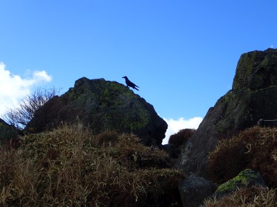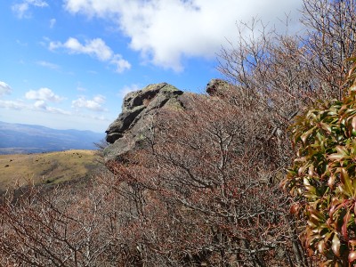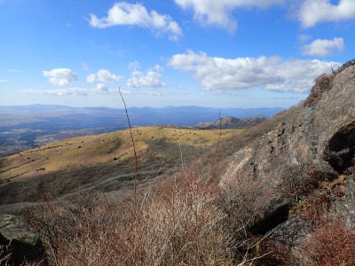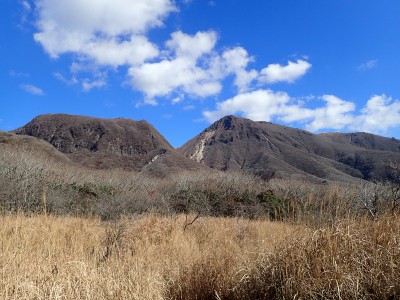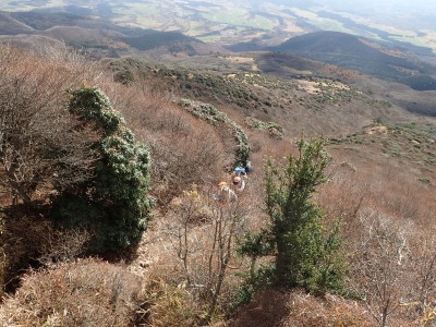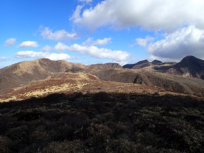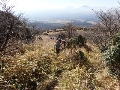 結構のんびりとしたが、集合写真を撮って下山開始。祖母傾の峰、阿蘇山、西には普賢岳などを眺めながら降る。そしてアセビ群の中に入る前にもう一度久住山、肥前ケ城、扇ケ鼻のお相撲さんのようなどっしりとした姿に分かれを告げた。