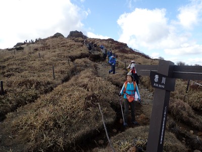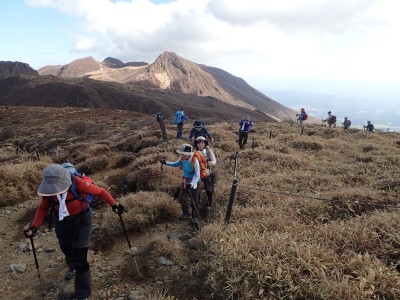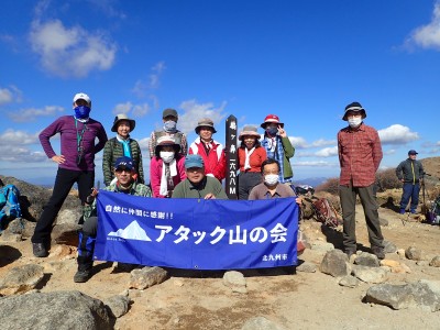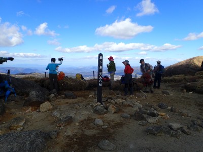 全員、無事山頂に到着。しばらく360度の絶景を堪能する。写真を撮っていた一人の女性に「どちらから?」と尋ねると「京都から」と言う。そのことを耳にした当メンバーはこれをきっかけに色々と話しかける。その女性は九重がとても気に入ったとのことだ。それを聞き、まるで自分たちのことが気に入られたように喜んでいた。(私もその一人だが)