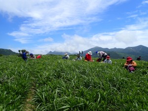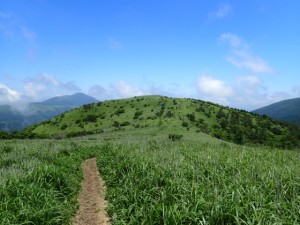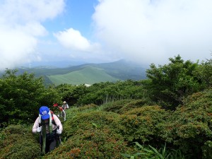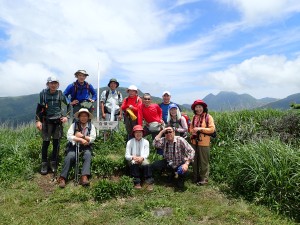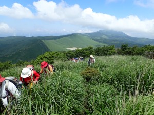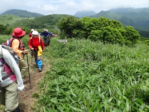 2015年6月28日 天気 晴れ アタック山の会 6月度例会登山 ■出発時間:7時00分 小倉南区葛原 ■メンバー:男7名、女4名 計11名 このところ天候に恵まれている。メンバーの日頃の行いが良いからであろう。 アタック山の会の6月例会登山は少々時期が遅いかもしれないがオオヤマレンゲの花が見れる山として猟師山を計画していた。 猟師山は、九重山系で南西に位置する。先月歩いた涌蓋山のスタート地点であった一目山の対面にある。牧ノ戸峠側からの登山ルートもあるが、オオヤマレンゲが群生しているのは西側の麓であるのでスキー場からのルートが便利である。 今回は11名の参加となったので車3台での旅である。北九州空港I.Cから東九州道を経て道の駅「豊前お越しかけ」でメンバーの一人Aさんをピックアップ、途中、道の駅玖珠でトイレ休憩をして登山出発地点である「九重森林公園スキー場」に。駐車場はこの時期でも解放されているので停めさせていただく。空は青空が広がり、清々しい。ゲレンデの端を歩き振り返ると先月登った形の整った一目山が見送ってくれる。ゴンドラ脇のキスゲはわずか2株だけであるが黄色い花を残してくれていた。登山口は散策路と書かれた標識がある。森の中に入ると黒くぬかるむ土の道である。林道に出るとここがオオヤマレンゲの群生地である。先客のチームの何人かがカメラのシャッターを切っていたのでホットしたがやはり花は一輪咲いていただけである。それでも全くないよりも良かったと思う。林道から再びぬかるむ登山道を喘ぎ、猟師山頂上に立つ。展望はないがここから合頭山までは見晴らしの良い草原歩きとなる。合頭山で昼食をし、帰路は往路を戻る。 無事下山した後は、時間も早いので山野草をたくさん育てている茶屋で休憩をして帰宅した。 今日も自然に山に山友に感謝!! ■コースタイム スキー場P-(20分)-散策路入口-(13分)-林道-(50分)-猟師山頂上-(13分)-スキー場との分岐-(14分)-三角点-(15分)-合頭山-(15分)-猟師山-(35分)-林道-(25分)-スキー場P ※休憩時間は含まれていません。全行程で約4時間半でした。 |