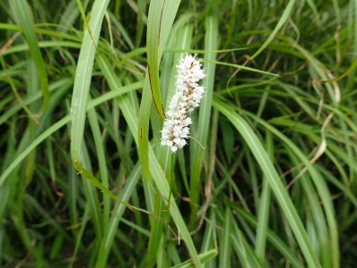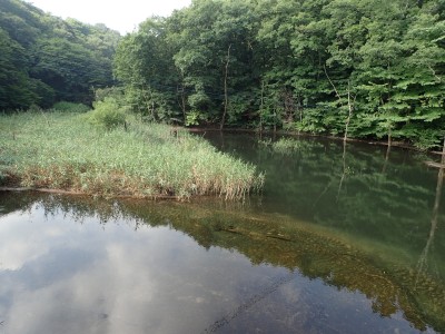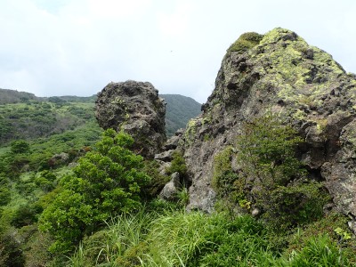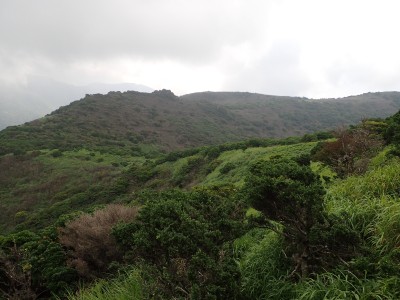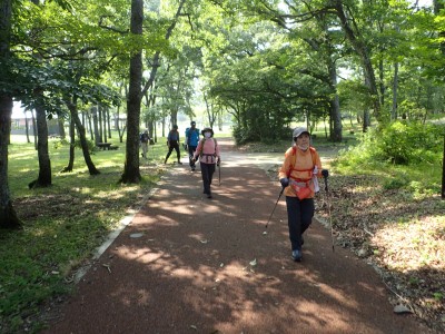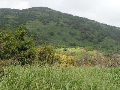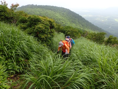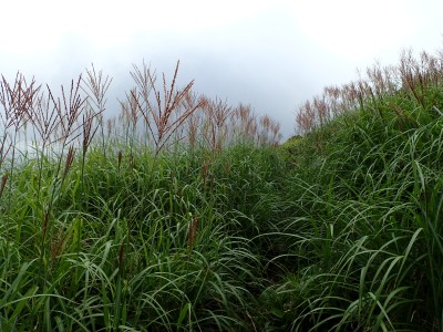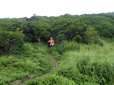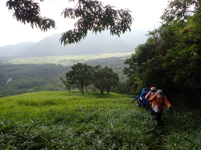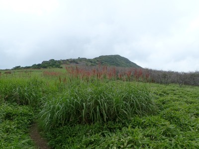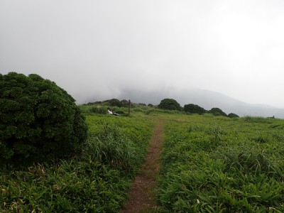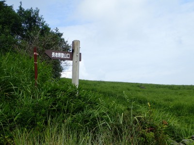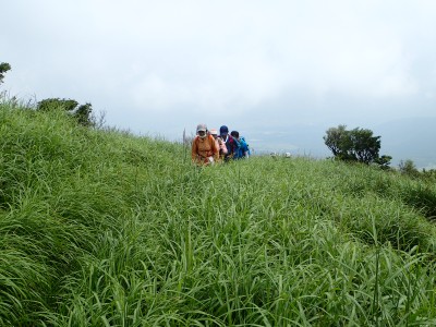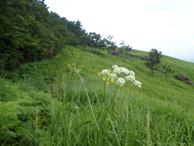 駐車場から草原に出るまでの道が少々わかりづらいが道標をしっかりと見つけていけば問題ない。森林と草原(牧草地)の際の坂を歩く。陽射しが強いので暑い。時折風がなびくと死んでもいないのに「生き返ったぁ〜」を口にする。高度を上げると見晴らしが良くなるが、今日は晴れているのに霞んで遠望がきかない。せっかく皆に景色を楽しんでもらおうと思っていたのにとても残念だ。
