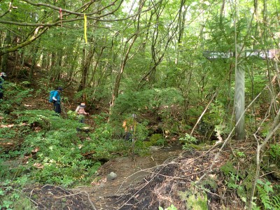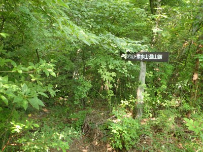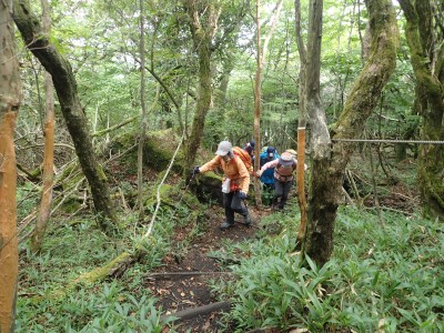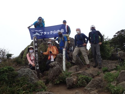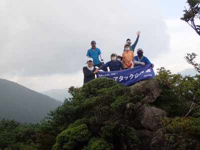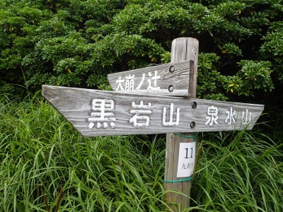背丈まである笹の縦走路に上泉水山の頂上はある。狭くて長居できない。ハーケンが打たれている岩のピークでもちょっとはしゃぎ、昼食場所をどこにするかと先を進む。結局、黒岩山の手前の分岐点まで行ってランチタイム。少々陽射しを受けるので暑いが、それでもカップ麺を食べれる暑さだ。昼食を終え、黒岩山の岩に立つが、視界はさっぱり。と言うかガスで覆われ何も見えない。