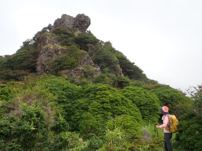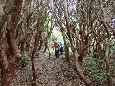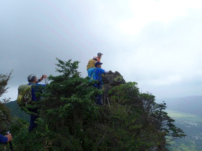 アセビの森に入るとぐっと涼しくなる。下泉水山の岩の上で童心に戻ったメンバーは元気で明るい。とても高齢者とは言えない。
