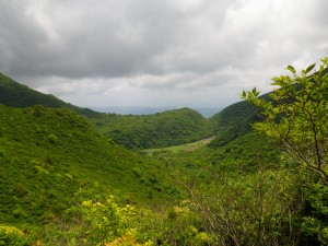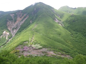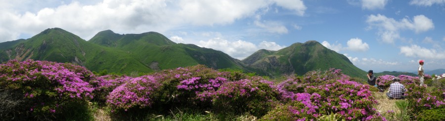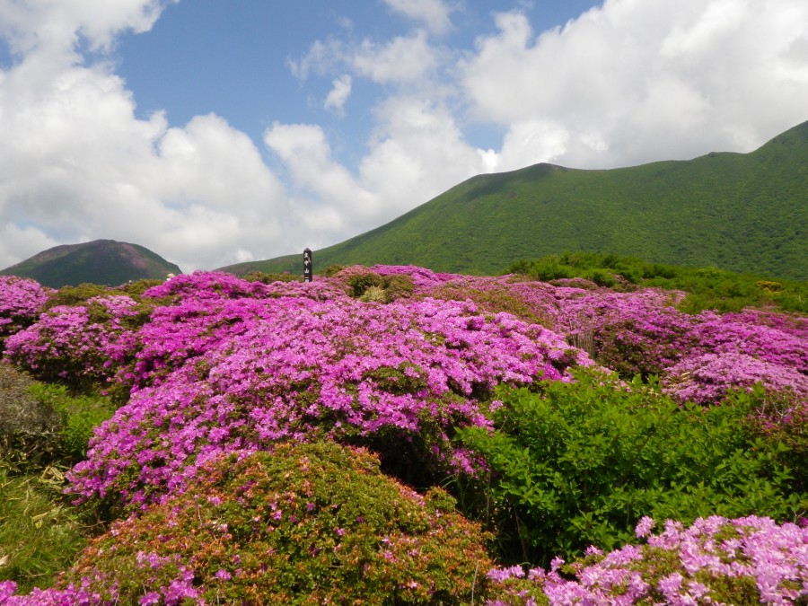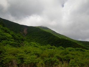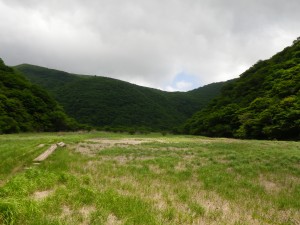 2012年6月3日 天気 曇り 「自然観察とボランティアの山の会」の7月例会登山は、星生山(九重)の計画だ。今日はその下見と言うことでいつものようにHさんの会社に集合した。 ■出発時間:6時30分 ■メンバー 男性3人 女性4人 瀬ノ本から国道422号線(旧小国街道)を竹田方面へと走る。くじゅう花公園手前で沢見方面へ左折し、納池登山口を探すが、よくわからない。狭い農道を車で行くと牧場があってどうやらこの牧場から谷間を詰めればきっとくたみ分かれに出るだろうと地形図を見ながら予想した。10時00分、車は、既に1台停めてあるので私たちも置かせていただき準備をして出発。予想通り牧場を抜けて樹林帯に入ると自然歩道に取り付いた。あまり歩いてないようで草が茂っていた。10時16分、すぐにくたみ分かれに着いた。沢見からよりも圧倒的に早いようだ。木道から平坦な泥の道となりとても歩きやすい。上りになると石がごろごろしてきた。苔むした石だらけの場所を過ぎるとジグザグの急坂となり10時54分、鍋割坂に着く。一息ついてさらに高度を上げ、再び岩の多い場所にぶつかると石仏や岩の壁を見て11時07分、鍋割峠に着く。ここから一旦降るとすぐに樹林帯を抜け、私の好きな湿地帯、佐渡窪へ飛び出る。周りは山で囲まれているのにここだけは砂と土と草しかない。木道は、水位が上がった時に流されたようで所々無くなっていた。佐渡窪を歩いて再び樹林帯に入ると石のごろごろした道から階段状の上りとなり、木の階段を上がる頃には視界が開けてくる。今歩いて来た佐渡窪も小さく見える。頭を上げるとピンクに染まるミヤマキリシマが見事である。下見なのにこんな贅沢なことで良いのだろうかとつい思ってしまう。11時59分、鉾立峠は風の通り道なのかじっとしていると寒いくらいだ。荒々しい白口岳とやさしく大きな三俣山が印象的である。立中山は、東側に取り付き点がある。狭い登山道を降ってくる人と譲り合いながら登り、稜線に出るとまたミヤマキリシマが見事に開花している。大船山を見ながら頂上を目指す。12時24分、ミヤマキリシマの花の中にたくさんの登山者で賑わう頂上に着く。展望は360度である。ようやくここで昼食とした。ほぼ食べ終わる頃、ヘリが坊ガツルから大船山への登山道辺りで旋回している。どうやら事故のようだ。(あとで調べると防災ヘリ「とよかぜ」だそうだ)メンバーのHさんが望遠鏡を持っていたのでしばらく様子をみていたが無事救出されたように見えた。12時50分、下山開始。往路を戻り15時00分、無事牧場に着く。今日も自然に山に仲間に感謝。 この後、少し先に正規の納池登山口を見つける。また、牧ノ戸と長者原は山開きとあって車が駐車場から溢れていた。 <コースタイム> 牧場-(15分)-くたみ分かれ-(50分)-鍋割峠-(45分)-鉾立峠-(24分)-立中山-(17分)-鉾立峠-(45分)-鍋割峠-(50分)-くたみ分かれ-(15分)-牧場 ※休憩時間は含まれていません。全行程で約.5時間かかりました。 |