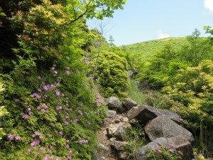 | 正面が立中山 | ミヤマキリシマが満開 | 振り返ると佐渡窪が見える |