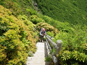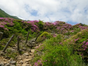 | 木の階段を上がる | ミヤマキリシマが見事 | 鉾立峠から白口岳を望む |