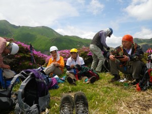 | 昼食 | 救助ヘリ 事故か? | ピンクに染まる平治岳 |
