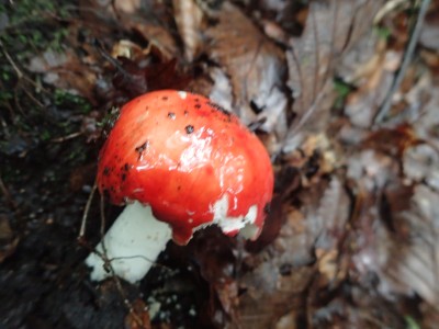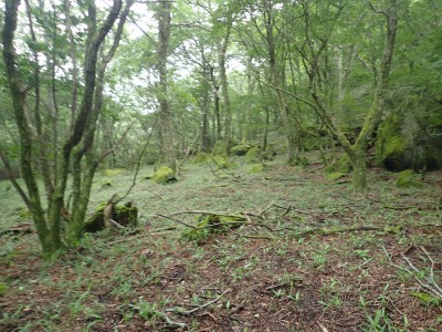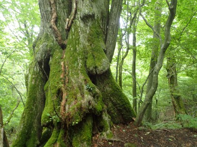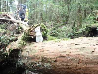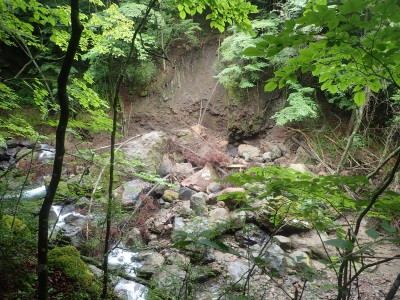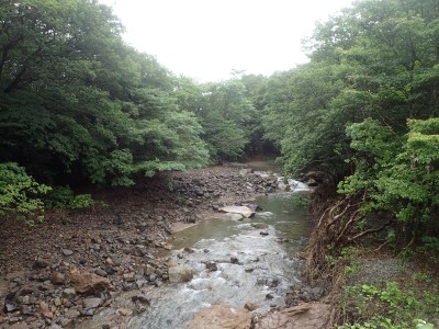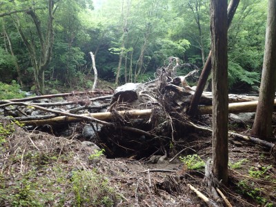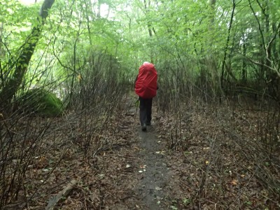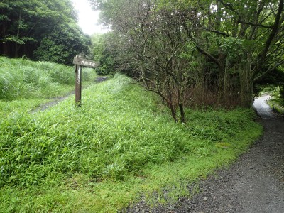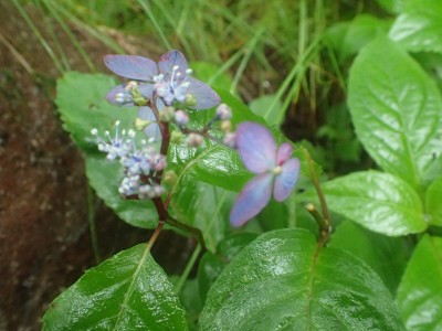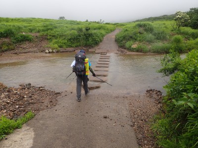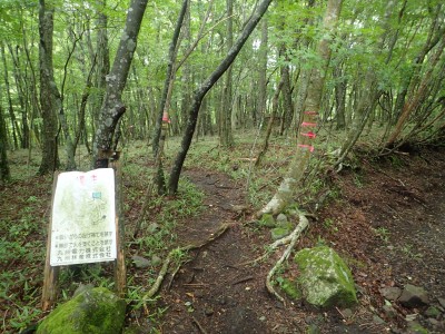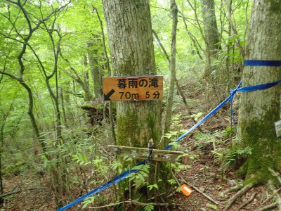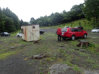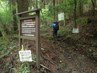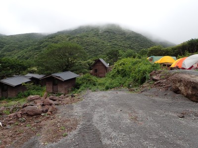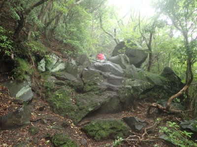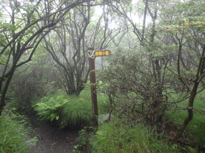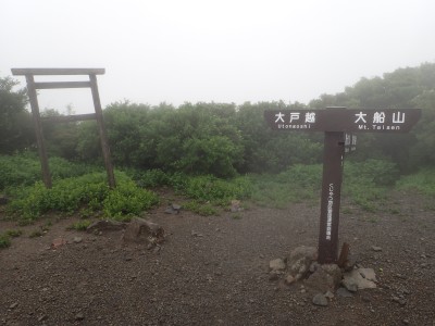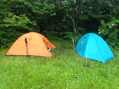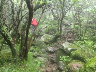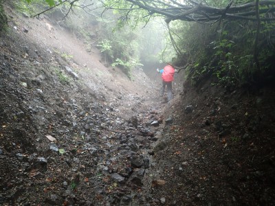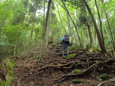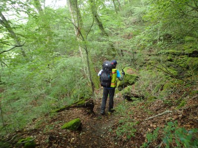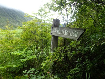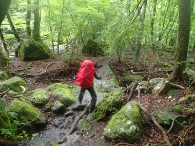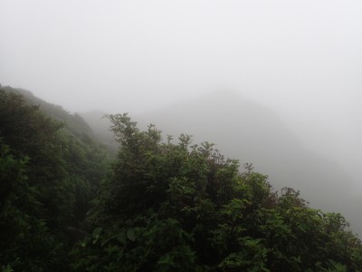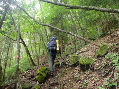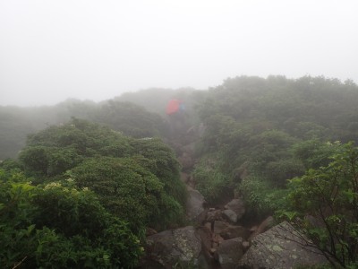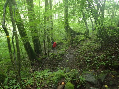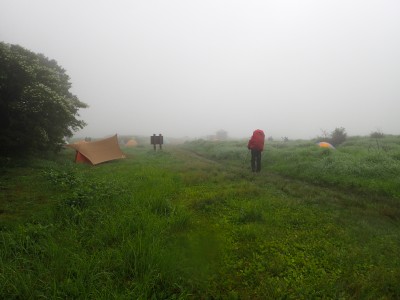 いつ寝たかわからないが、結局一晩中フライシートはポツポツと音を立てていて朝起きても霧雨の中、食事をしてテントをたたむことになった。天気は下り坂のはず、今回は下山することに。帰路は大船林道を降った。