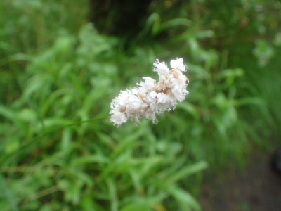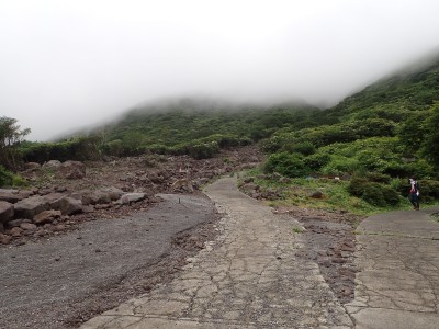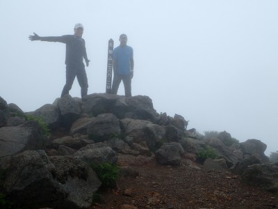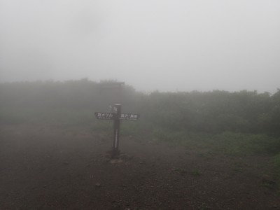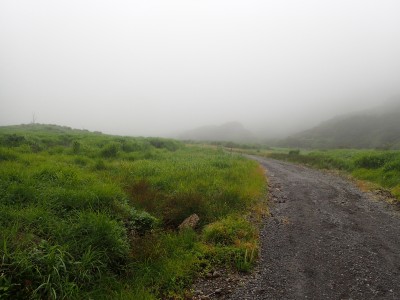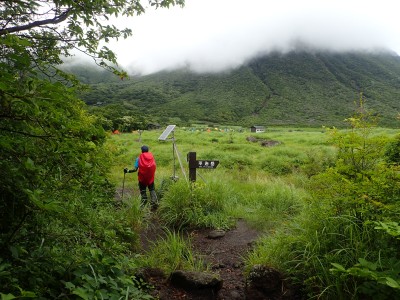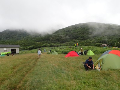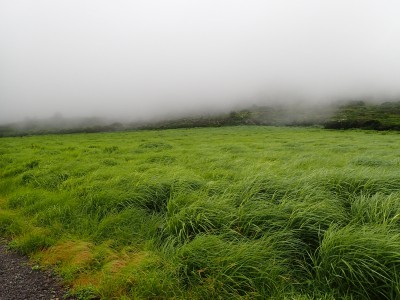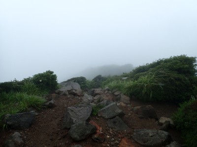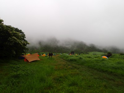 吉部登山口からしばらく急勾配が続く。平坦になると鳴子川沿いに山腹をひたすら歩く。途中、暮雨の滝へ立ち寄り大船林道の合流点からは砂利道を歩く。草原が広がると右に三俣山、左に平治岳が望めるはずだが、ガスでちょっと先しか見えない。風があるのでガスも上がるだろうと期待して坊ガツルに到着。重い荷物を下ろし、早速テント場を確保し設営する。軽く昼食をとり、ザックを軽くして大船山に向けて出発。その頃にはガスは抜けるどころか霧雨になってきたのでこれが私だけなら登頂を諦めるところだが、ヨッシーは「初めての大船山」なのでガスでも行ってみようとなった。段原(だんばる)までガンバルできつい登りを耐えて大船山まで、幸い風がなかったので岩場も楽にクリアできた。山頂は、期待はしていたがやはり360度、真っ白。ここからの遠望は私は何度も見たのでその素晴らしさを想像できるが・・・・・。ヨッシーには、「また天候が良いときに登ろうと」言うしかなかった。