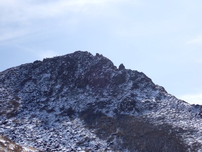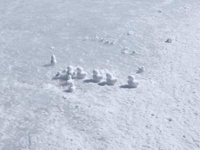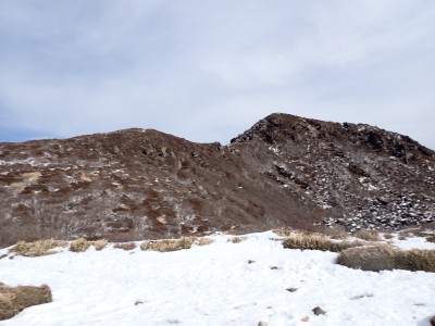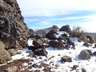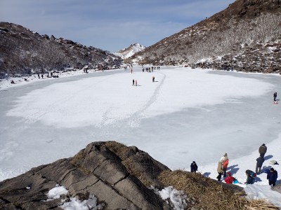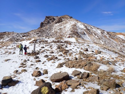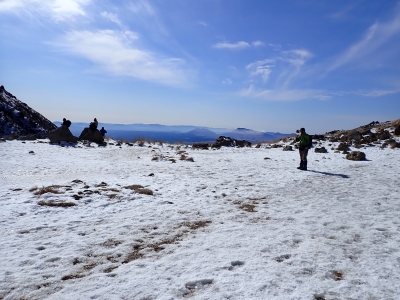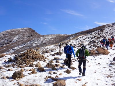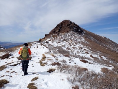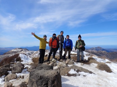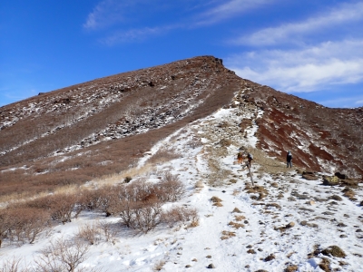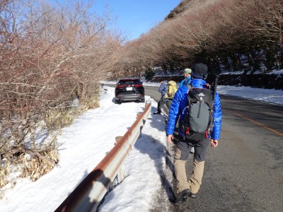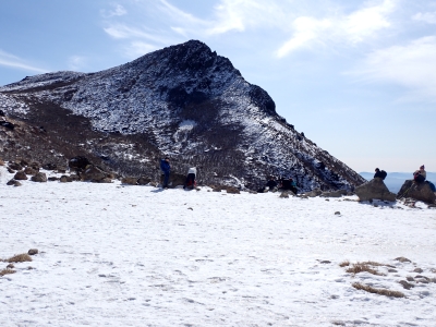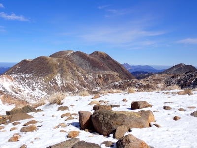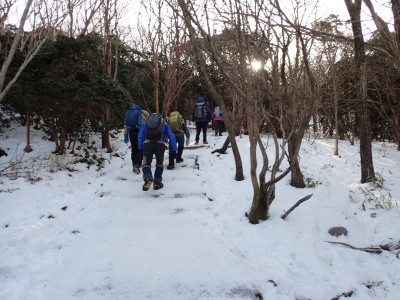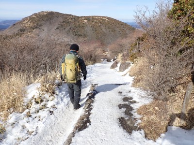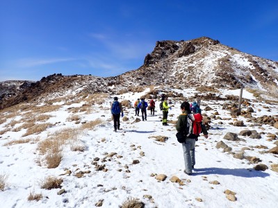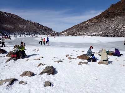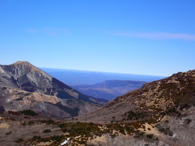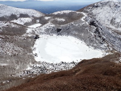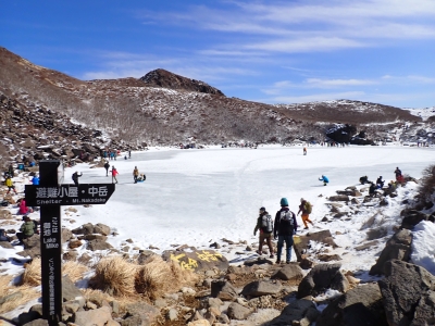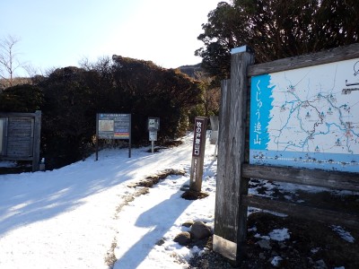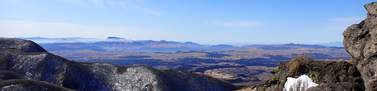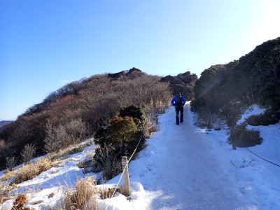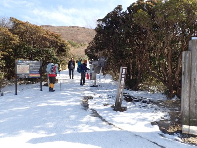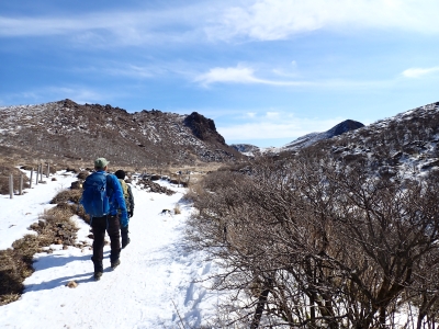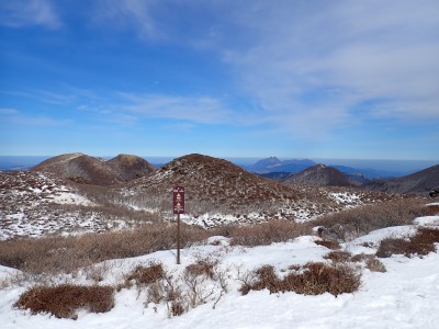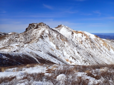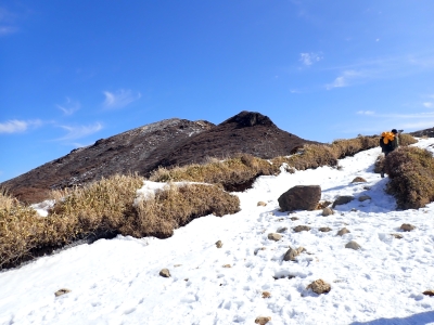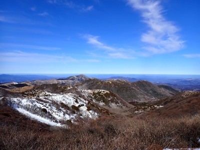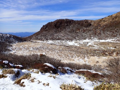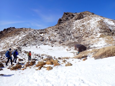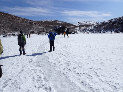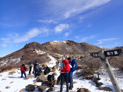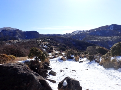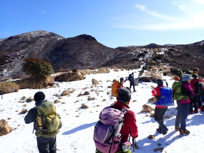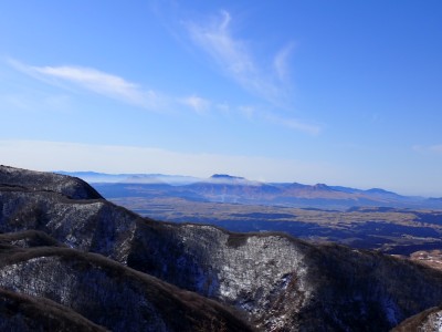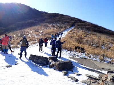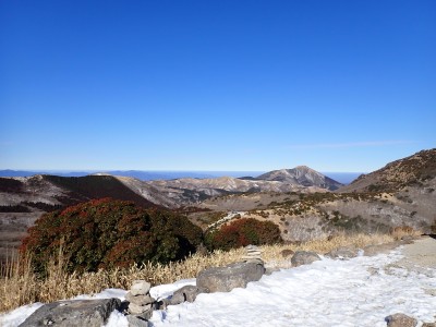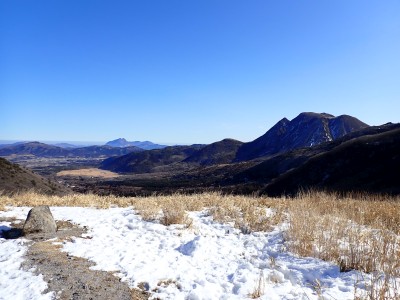 今回は、がしんさんの企画で九重の氷結した御池を見に行こうと言うことになり、山の会のメンバー5人が集まった。私も昨年の8月以来の九重なので楽しみだ。さて案の定だが、牧ノ戸峠混雑は相変わらずである。この混み用はいつからだろう?確かにミヤマキリシマの季節は大混雑していたが・・・・・。何とか路肩に停め峠のレストハウスへ。ここまで道路は雪もなく凍結もしていなかたったが、登山口からはアイゼンが必要なのは明らかだった。そこでアイゼンを装着し出発。車がこれだけ多いのだから当然人も多く列を作って歩き始める。第一展望所につくと眺めに圧倒される。由布岳が目の前に迫っている。これだけ近くに感じたのは初めてである。第二展望所まで結構きつい登りだ。景色は衰えることなく第二展望所では阿蘇山と外輪山が目の前に現れた。写真ではあまり迫力を感じないが、実際に見る景観はすごい。眺めを味わいながらと言うか「目で噛みしめる」というか、変な表現だがそんな感じで沓掛山を通過する。平坦になるとアイゼンを一旦外す。登山道は雪が少なくシャーベット状になってたからだ。左に星生山を見ながら扇ケ鼻との分岐へ進む。日陰になると雪は片栗粉のような感触が登山靴を通じて伝わってくる。そうキュッキュッと。反対から来た若い女性の登山者が、「片栗粉のようね」と同行者に話すのを耳にしたが、やはり皆同じ感触なんだろう。西千里浜を左手に平らで広い道を進むと久住山が見えてくる。いつもは大らかな姿だが今日は少々荒々しい。避難小屋から久住分れを過ぎ片栗粉を踏みながら御池に着く。わっ!何と昔見たスケートリンクではないか。大勢の人が氷上で楽しんでいる。スケートをしている人はいないが、ソリ?スノーボードと言うのか、引っ張ってもらって遊んでいる人がたくさんいる。私たちはこの時期にしか歩けない池を横断した。そして池の渕の岩上でランチタイム。青空が広がり晴れているが、気温は低く、風が少しでも吹くと寒い。早々に食べ終わり、次は中岳の予定であったが、昨年から股関節の痛みがある私に皆気をつかっていただき天狗ケ城のみ登ってそのまま往路を下山することとなった。天狗ケ城からの絶景を楽しみ下山開始。再び眺めを楽しみながら無事牧ノ戸峠に着く。帰りに立ち寄るはずの温泉はなぜか休館日となっていたのは残念だったが、帰路の運転はU氏がしてくれたので楽だった。山仲間との山行はやっぱり楽しい。今日も山に自然に感謝!!
