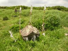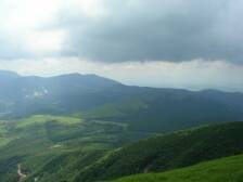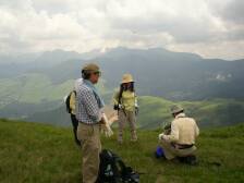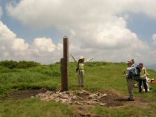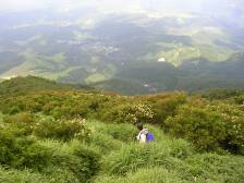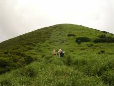 前ページからの続き 涌蓋山山頂から急斜面を下り、平坦なヤセ尾根を行くと山頂から15分程度で女岳に着きます。展望は360度です。ユウスゲの群落を見て緩やかな草原を下り、Yさんと合流です。日陰はありませんが、爽やかな風が時折あるので12時もまわったことでもありますし、ここで昼食としました。(Yさんが一人で食事は淋しいだろうと思い) 昼食を済ませたら出発です。草原から林を下り、涌蓋山山頂から約60分で林道の出ます。ここが涌蓋越です。林道を左(南)に行くとすぐに右手に標識がありますのでここより山道に入ります。平坦な林の道をしばらく行くと急に開けます。正面にはミソコブシ山が見え、手前には広い草原が広がります。牧草地です。平坦な草原をしばらく歩き緩やかな上りを牛の糞を踏まないようにゆっくりと進みます。涌蓋越から約40分でミソコブシ山山頂です。ここも360度の展望です。ミソコブシ山から一旦下り、20分程度歩くと次のピークです。ここは左回りにエスケープルートがあります。ピークを下り、柵を超え、一目山の標識にぶつかり右手に標識のとおりすすみ、いつのまにか林道歩きとなり、抜けると舗装された道に出ます。ここが一目山の鞍部です。左手には木の標識があり、右手には「湧き水」の案内板があります。せっかくですから湧き水に行って見る事にします。(往復10分もかかりません)湧き水は冷たく、おいしい水でした。ひと時の涼を楽しみ、再び炎天下を行きます。時間的にも日差しが強く、急登なのでかなり体力を消耗します。次ページへ |