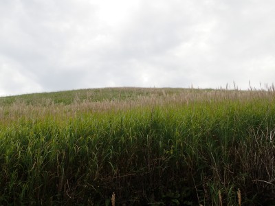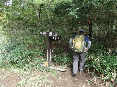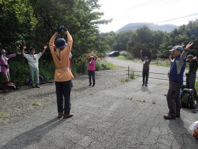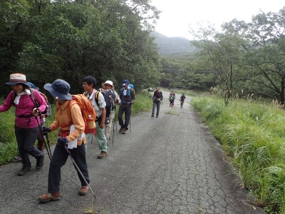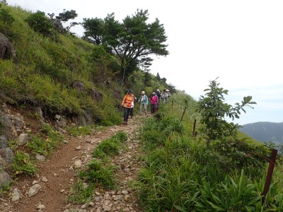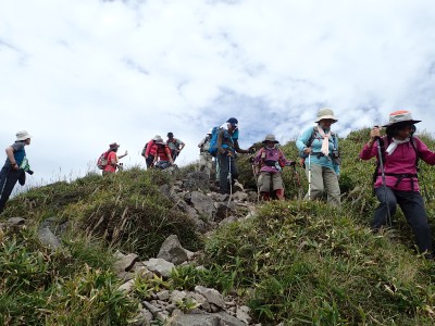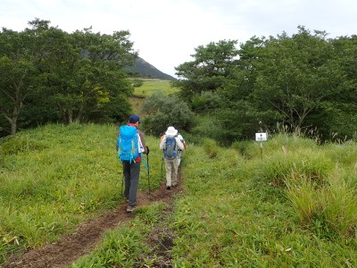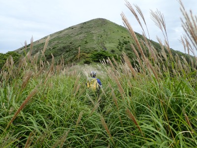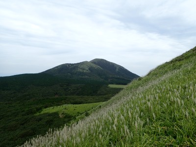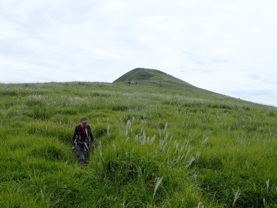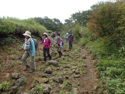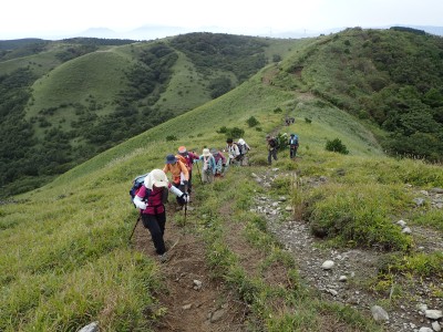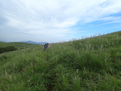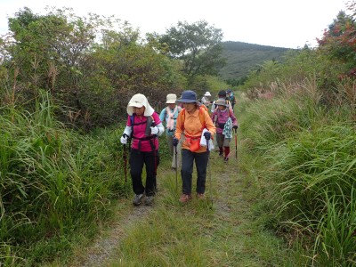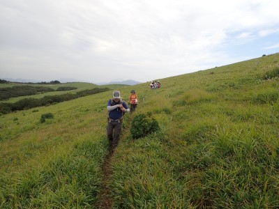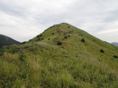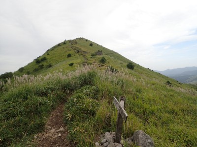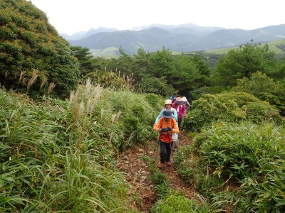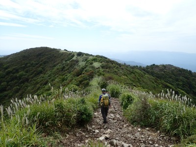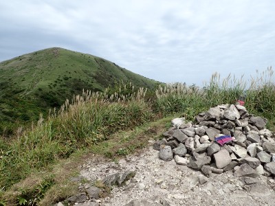 やはり、人気の山だ。曇り空の下、体操をして出発。一目山の斜面はススキの穂が一面に広がり、秋の香りがしてくる。草原が広がる稜線からの眺めは、どんよりとした曇り空でこれが真っ青な空が背景にあればもっと爽快なのにととても贅沢なことを言う自分に呆れる。雨が降らないだけでも快適な旅なのに。