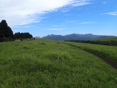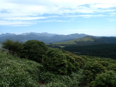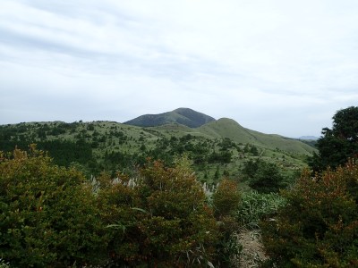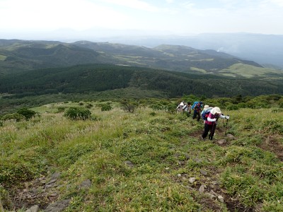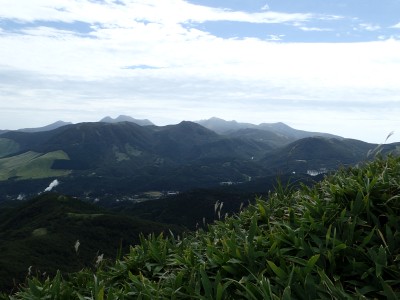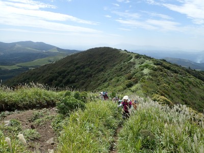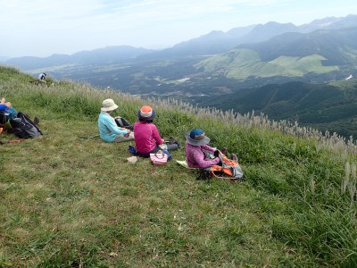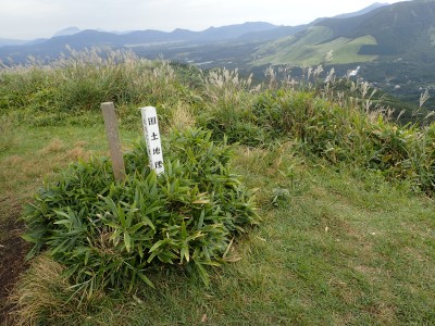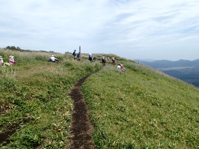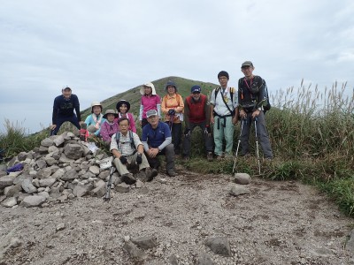 少々きつい登りを経てミソコブシ山に到着。360度の展望は、東に間近に見える九重連山、その奥に由布岳、そして南には阿蘇山。ここで集合写真である。