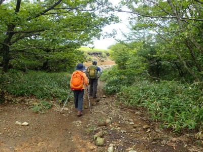 ミソコブシ山から降りは、牛が放牧されている場所であるが、今日は見当たらない。道に牛のいた形跡も見当たらない。牧場はどうなっているんだろうと思いながら川原を過ぎて柵を越え林道に出る。ここが涌蓋越となる。ここからはしばらく赤松の多い樹林帯を歩く。樹林帯を抜けると徐々に勾配がきつくなり、ピークに立つとそこは女岳だ。目の前に涌蓋山頂上部がデンと現れる。ここでも集合写真を撮る。