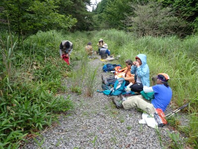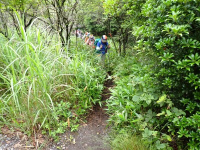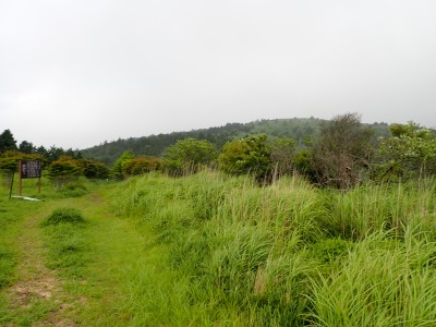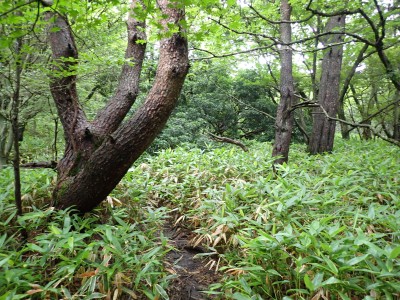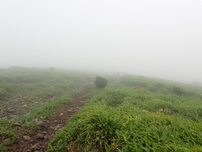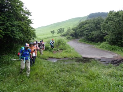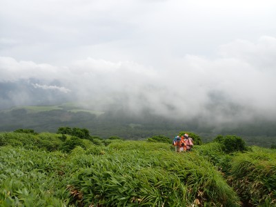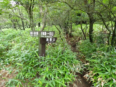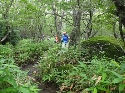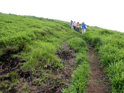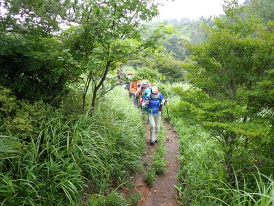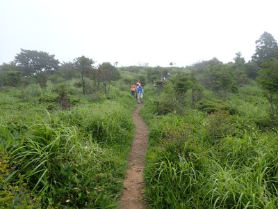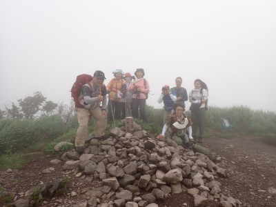 さて、アタック山の会の臨時山行として企画したのは良いが、梅雨のような天候となり、雷雨も心配だ。毎度のことだが、前日まで天気予報と睨めっこが続き、今日だけ何とか「曇り」となった。朝、集合場所に集まると全くもって心配ない天候だ。移動している内に青空も覗いてきた。ところが、色彩ロードに出ると何と涌蓋山はすっぽりと雲に覆われているではないか、このようなことは山では度々で下界は好天だけど山だけは厚い雲に覆われている。今回も同じだ。夏山ではよくあることだ。車を停め、準備体操を済ませ出発。順調にみそこぶし山、涌蓋越と進み、森を抜け勾配がきつくなってくるとガスに覆われ風も強くなってくる。女岳まで来たが風は益々強い、視界は効かず、登頂を諦めることにした。メンバーの中にはお初の人もいたので頂上からの展望を楽しんでほしかったと悔しさが残るが、安全第一だと撤退を決めた。そんな思いを察してか、他のメンバーからは「雨に遭わないだけ良かったやない」「涼しくて良かったとか・・・・」。涌蓋越でランチタイムを過ごし、往路を戻る。やはり涌蓋山頂上付近は未だ厚い雲に覆われたままだ。涌蓋山のリベンジは過去一度ある。「また来いと言うことか」と自分に言い聞かせた。今日は皆の気遣いをとても感じた山行だった。今日も山に自然に仲間に感謝!!