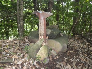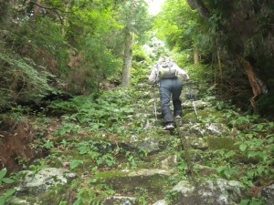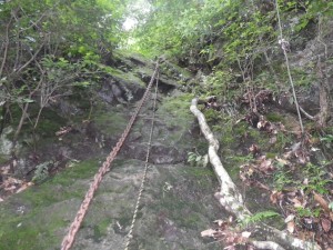 2012年7月29日(日) 天気 曇りのち雨 ■出発時間:午前6時30分(自宅) ■メンバー:家内と私の2人 梅雨も明けたようなので今日こそは雨に会わずに済むだろうと思っていたが、途中で雷まで鳴り出す始末。結局、今日の山行の一番難所である鎖場は、諦めて引き返すことになった。 自宅を出発した私たちはルンルン気分で国道を宇佐方面へと走る。休日割の恩恵を受けて由布I.Cまで高速を飛ばす。I.Cを降りたら道の駅「ゆふいん」でトイレ休憩をして湯布院のコンビニに立ち寄り、庄内町へと国道210号線を南下し、庄内庁舎の交差点より右に地方道621号線を阿蘇野川沿いに進む。しばらく行くと右手に熊群神社参道入口と看板がある。車は左側に駐車スペースがあった。工事が終われば、結構たくさん停めれそうだ。 9時17分、既に陽射しは肌を焼きつけるくらい強い。コンクリートの道を歩き始め鳥居をくぐると樹林帯の中となりホッとする。畑のような場所を道なりに進むと右手に神楽殿にぶつかる。手前に「熊群神社これより徒歩20分」とあるのでその道を進む。日陰に入ったので涼しく感じるが湿気が多いので汗は噴き出ている。コンクリートの道は苔が付いて滑りやすい。道は砂利道となりジグザクに高度を上げる。鳥居が見えると道が3つに分かれた。道標はないので地図を見るがどうも良くわからない。とりあえず、鳥居をくぐり先を進むが途中で行きどまりとなった。再び鳥居まで戻るとちょうど男性1人が歩いて来て「神社はどこですか?」と聞かれる。しかし、こちらも迷っているので『鳥居の先は行きどまり』としか言いようがない。そこで鳥居の右横の道を行くことにした。少し降り気味なので不安だったが、すぐに岩屋があるのでこの道で間違いはないようだ。(後からこれが北宮だと知った。)カーブにある水場を過ぎると護摩殿に出た。手前に石段があるので滑らないように進む。それにしても急だ。石段が終わったと思ったらまたまた石段がある。ようやく石段を登りきると上宮に着く。(この石段も鬼が一夜にして築いたと伝えられているらしい) 10時30分、帰りはここを降ると思うと憂鬱になるが、商売繁盛の御利益があるとのことでお参りをして出発である。急斜面を少し進むと目の前に太い鎖のかかった絶壁にぶつかる。家内のために14mのザイルを準備して私が先に登るが、とにかく足元が滑る。おそらく乾燥していればナンチャナイのだろうが、今朝も雨が降ったようで滑りやすい。足場が確保できるところでザイルがちょうどギリギリとなった。その時に雨が急に降り出しておまけに雷も鳴り出した。せっかくここまで来たが、ひとまず上宮まで引き返すことにした。 11時10分、上宮で雨宿りを兼ねて昼食とした。雨は、一時小振りになったが、相変わらず降っている。雷も止まない。どうも止みそうにない。悔しいが下山を決めた。 12時00分、雨具を着て下山を開始する。登ってきた石段は要注意だ。石段を降り切ると後は楽な道だ。雨は未だ止まない。 12時35分、「熊群神社これより徒歩20分」の案内板まで無事到着。樹林帯を抜けると遠くに青空が見える。雨もほとんど止んだようだが、山頂付近は黒い雨雲で覆われている。 12時47分、熊群神社参道入口に無事下山。汗と雨で濡れて気持が悪いので帰路の途中で温泉に入り、帰宅した。山頂まで行けず、残念ではあったが、雨にも関わらず何事もなく無事下山でき今日も自然に山に感謝である。・・・また次回があるさ・・・・ ■コースタイム 熊群神社参道入口-(15分)-神楽殿-(45分)-護摩殿-(15分)-上宮-(6分)-絶壁-(5分)-上宮-(12分)-護摩殿-(25分)-神楽殿-(10分)-熊群神社参道入口 ※休憩時間は含くまれていません。全行程で約3時間30分でした。 ■おまけ みことピア ほのぼの温泉館・・・・・ 由布市庄内町庄内原355-1 TEL(097)582-2864 大人300円 ※露天風呂もありました。石鹸等は持ち込みで備え付けはありません。 |