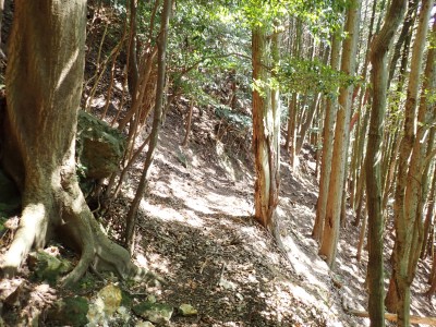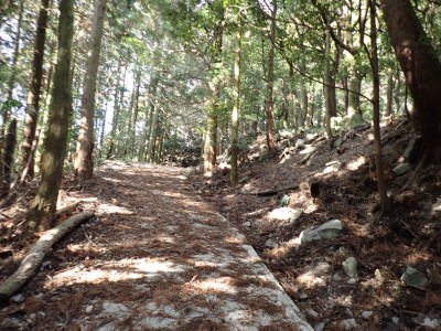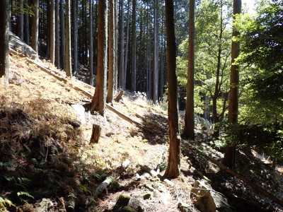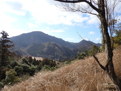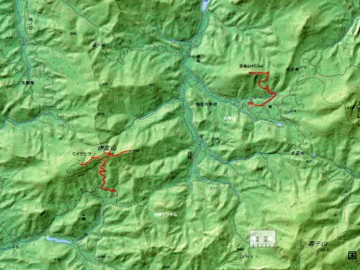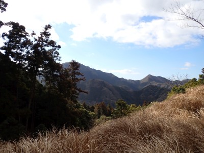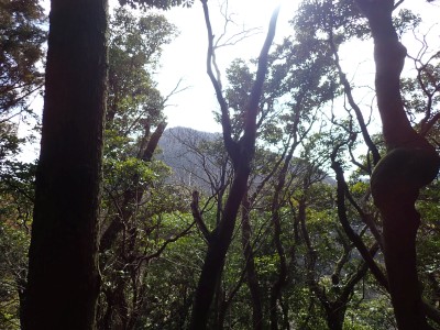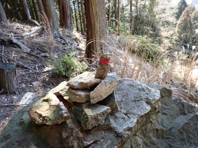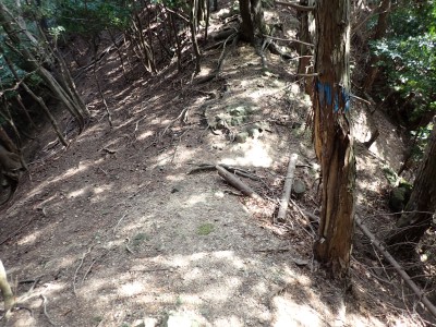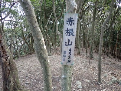 神殿前の広場に駐車させていただき出発。登山口は県道544号線沿いとなるので畑の横を通り舗装道に出ると水谷峠方へと歩く。すぐに自動販売機があって民家が数件あるとそこからコンクリートの道に入る。民宿と書かれた家の横を通ると林道になり、そのまま進むと次第に林道が「道」と言えない状態となって岩壁を右に巻くように行きカヤを掻き分けて開けると鞍部に出る。そこにようやく小さな標識に赤根山とある。尾根に取付いて良い気分になるが、急斜面が待ち受けていた。「行きはよいよい帰りが怖い。」と言葉が出るほど降りは怖いだろうと思うくらいな斜面だ。登り詰めると頂上は樹林に囲まれ展望はない。わずかに千燈岳が覗けた。次があるので長居はせず往路を戻り神社で再度お参りをして次の山へと移動する。次は伊美山とミイケヒラ、伊美山の名は伊美川などあるので土地の名前とわかるがミイケヒラはカタカナで表記されていて例えば「三池平」にすると意味がわかるが池はない。確かに山頂は平らなのでヒラはわかるが、なぜカタカナなのか?一体誰がこの名をつけたのか?ネットで検索しても同じような疑問を抱いた方はいらっしゃるが答えはない。考えてもわからないので諦めることにした。