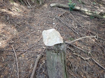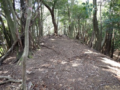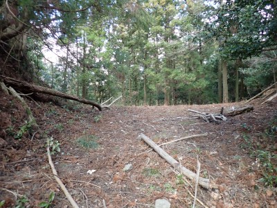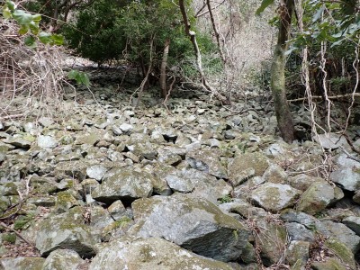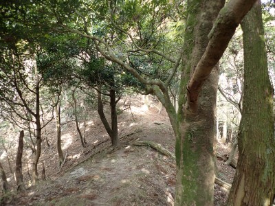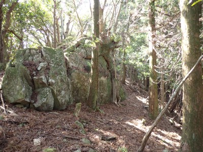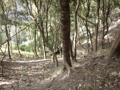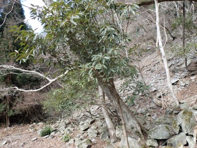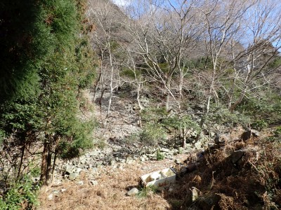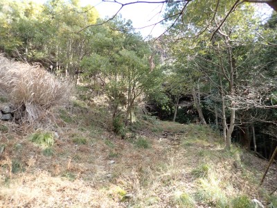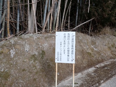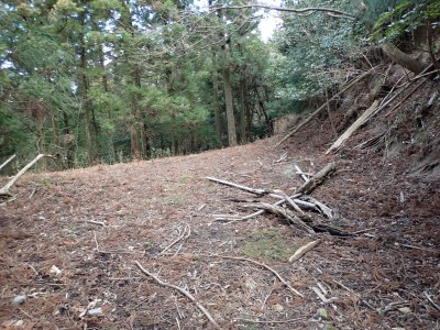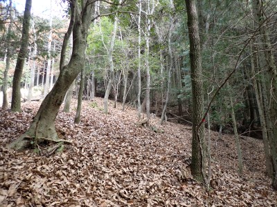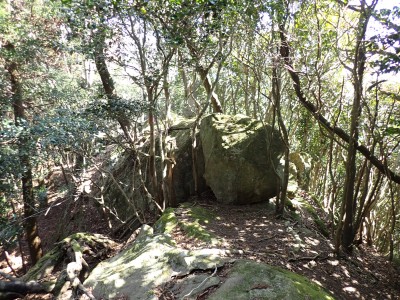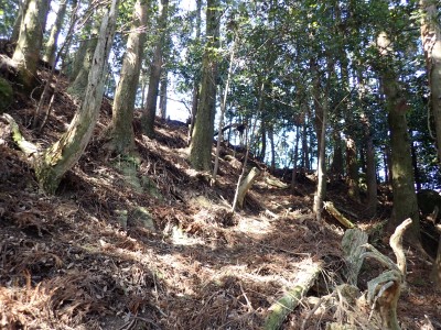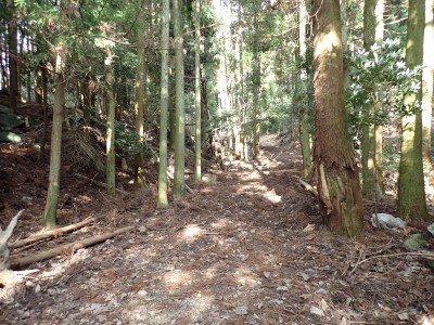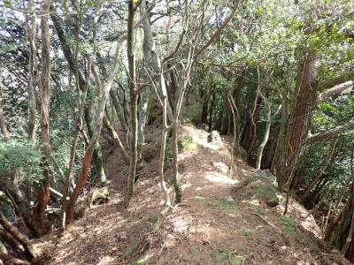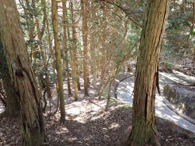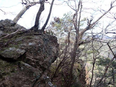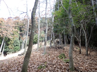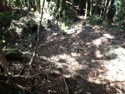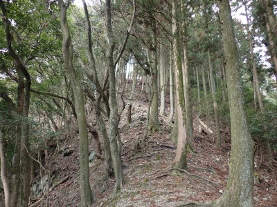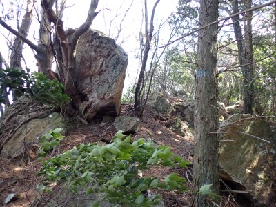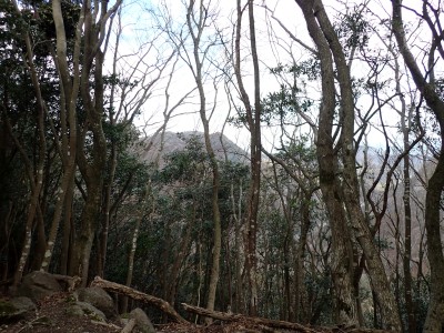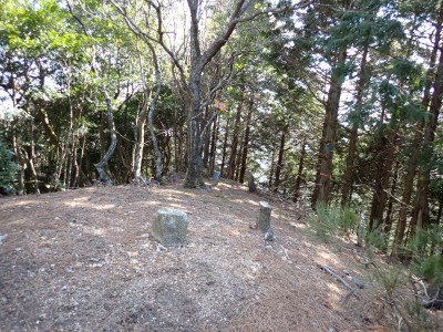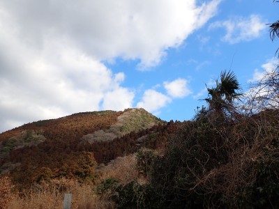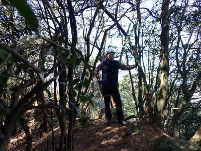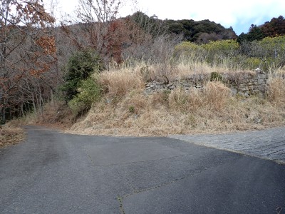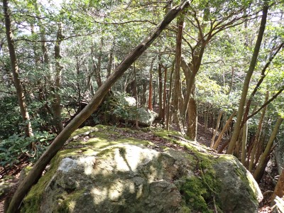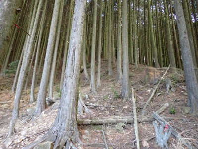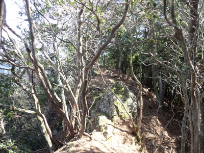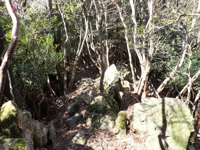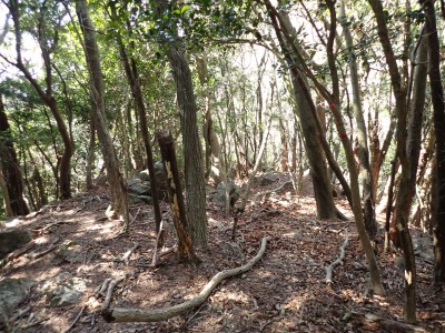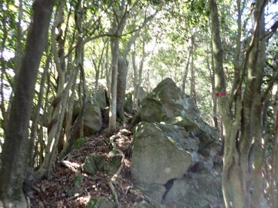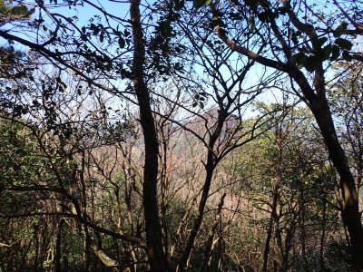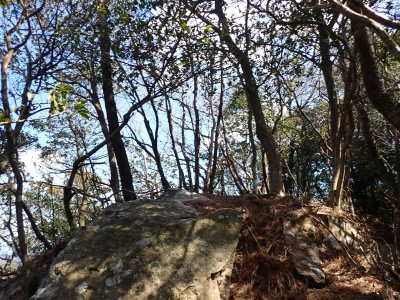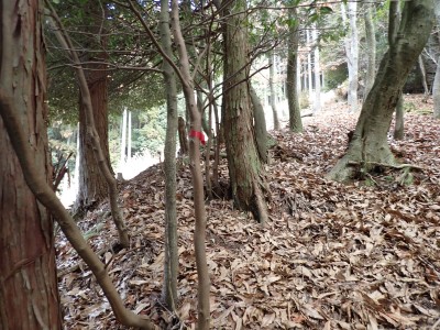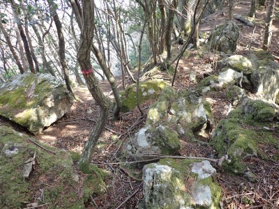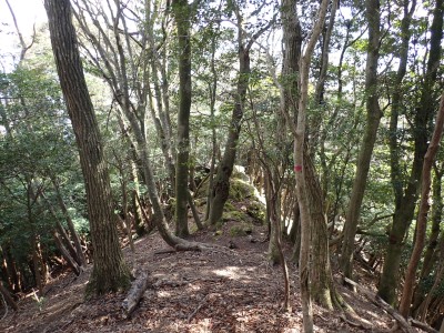 さて登山口は、古幡社から地方道31号を天然寺方面へ戻り地蔵トンネルを抜けるとすぐ右手の林道を入る。大きく左にカーブする所に広い空地があるのでここに停めさせていただく。舗装道を行くと集落を抜け、道が分かれるが右手の坂道を進む。すぐに鎖がかけられたゲートがあるのでそのまま進み、左カーブの右手のカーブミラーに小さな登山口標識を見つける。落葉のせいか踏み跡はなく、赤テープを辿るが、途中で左に巻かないといけないところを右手にそのまま急斜面を進んでしまい結構大変だった。ただ、伊美山の三角点に行くには無駄のないルートだった。急斜面から稜線に出るとやや後ろ向きの尾根を進み三角点に到達。特に珍しいものはないのですぐに往路を戻り、今度は伊美山頂上。狭い頂上なのでゆっくりとする気分にもならず、先へと進む。狭い尾根は岩がたくさんあって樹木がなければ魅力的な露岩帯であろう。降りきって鞍部に出るとそこは登山口への分岐点で下山はここから降る。岩の多い尾根を今度は登り気味に歩いて樹林に囲まれた薄暗い場所にミイケヒラの山頂標識を目にする。表示がなければ通り過ぎてしまうような場所だ。北に少し行くと林道終点のようで空地が見える。下山は往路を戻り鞍部の分岐点よりしっかりとした踏み跡を降る。