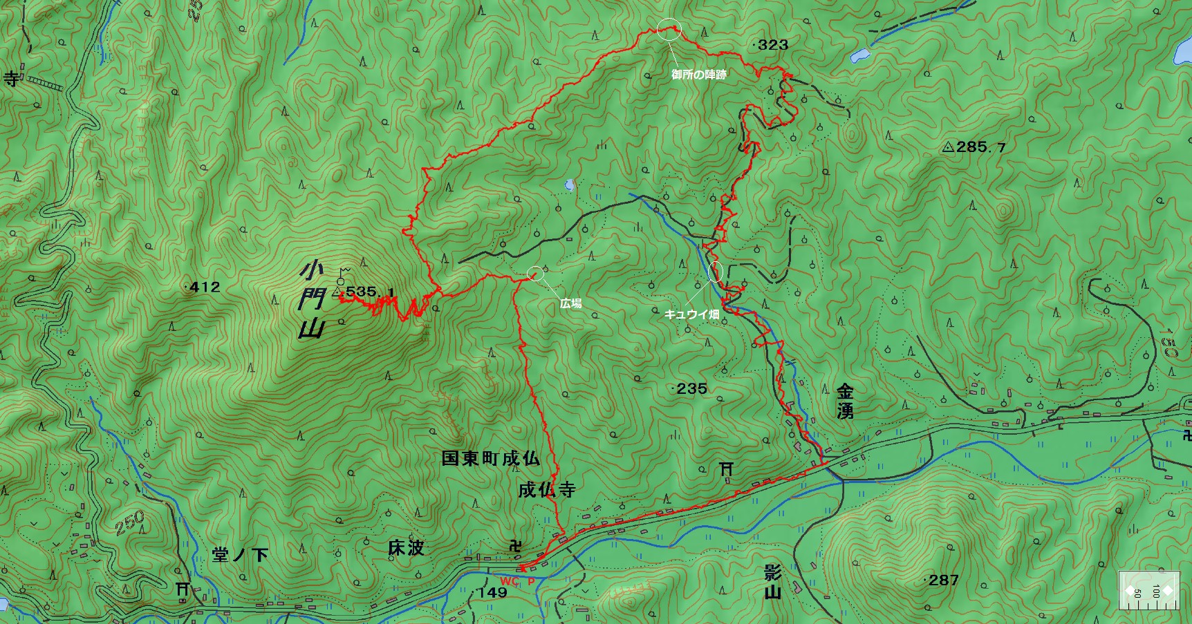 小門山登山コース(GPSによる歩行軌跡) 縮尺約 1/12000
