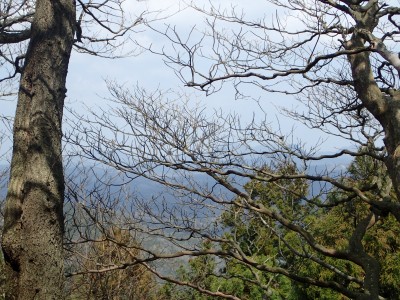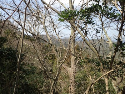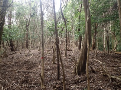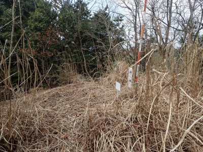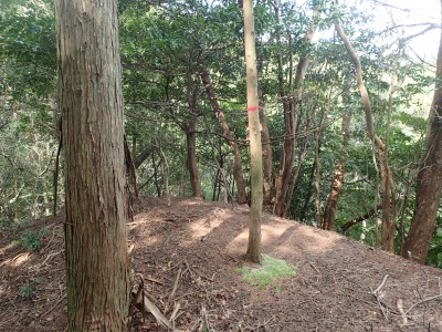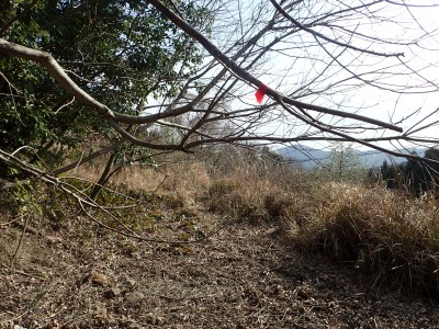 尾根伝いに赤テープを見つけながら進むとヤブの中の三角点のある山頂に着く。山頂らしくない山頂ではわずかに木々の間から鋸山が見える。写真を撮って少し下った広場でランチをし、往路を戻る。ガイドブックにもあるが、この山も地図は必須で帰路で間違って支尾根に入り込む恐れがあるので注意だ。さあ次は鉄輪ケ城