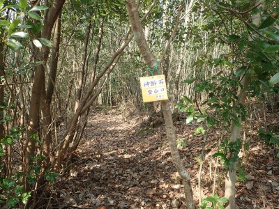 自宅から東九州道を走り大分農業文化公園I.Cで降り、県道42号から一旦国道10号線に出て再び地方道を行く。鋸山の登山口でもある鋸山トンネルを抜け、さらに金谷隊道を抜けるとすぐに神酔石の登山口となる。車を駐車できるスペースはトンネルを抜けてすぐの右手の作業道の入口だけ、邪魔にならないように停める。さて、登山口は?道路を横断し、それらしき場所をよく見ると赤テープがある。道と言う道ではないが少し行くと広場に出る。振り返るように左に目を向けると豊嶺会の道標があった。これを見るとホッとする。竹ヤブ中を金谷隧道の上部に向けて進むときれいな雑木林になり尾根に取り付く。しばらくすると樹林の中に巨石群が現れ、すぐに大岩のある山頂に着く。残念ながら展望はない。大岩の上に立つと三角点の石柱が埋め込まれているのがわかる。帰路は往路を戻る。