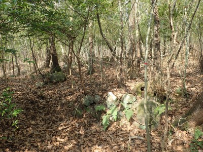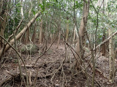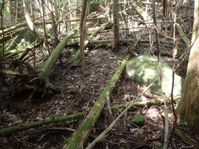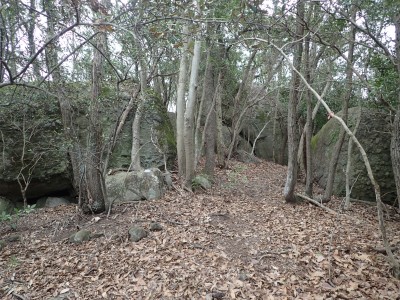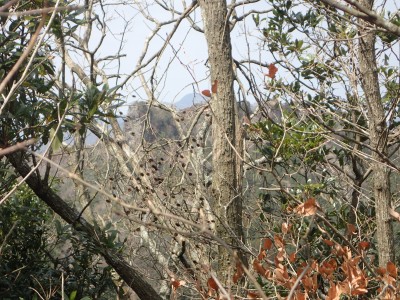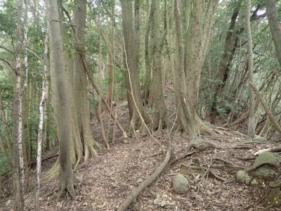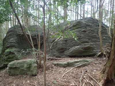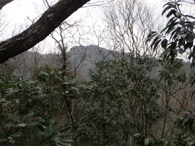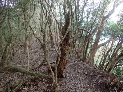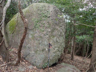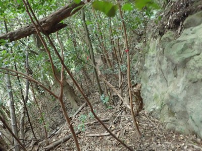 既にここに来て30分ほど経過している。「国東半島山ガイド(豊嶺会編)」の掲載されている山のほとんどは登山口としての明確な表示はない。本には登山口のQRコードが付いていてスマホで確認できるようだが、電波状態が悪くネットがつながらないような場所では事前確認が必要だ。 さて車で何度も行ったり来たりして探した登山口は、歩くとすぐにわかった。「小さな林道」と「ポンプ小屋」は、確かにあった。コンクリートの道がシャガの葉がたくさんある道になり樹林に入るとすぐに右手に登山口標識があった。ここから尾根へと道なき道を急登し、尾根に取り付く。赤テープはあるが道標はない。樹林帯を適当に歩くと突然目の前に大きな横縞の入った岩が現れた。岩と言うよりも何かモンスターのようで私には不気味に感じる。さらに尾根を進むと右が切れ落ちた道となる。地形図を見るとちゃんと「崖」の記号がある。さすがだ。