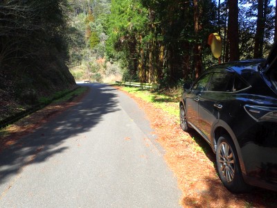 ところが登山口がわからない。ガイドブックでは「カーブミラーの横から伸びる小さな林道・・・」とあるがカーブミラーは複数あるし、林道らしきものがない。又ポンプ小屋が目印とあるので探すがない。これはもう車で行ったり来たりしても見つからないし、地元の人に怪しまれてもまずい。車を置いて歩いて探そうとするが駐車スペースがない。まずは、駐車スペースをとバス停のところから北へ車道があるのでそちらに入り込むと右脇にスーペースがあった。