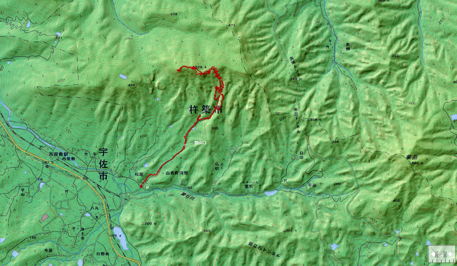 津波戸山登山コース(GPSによる歩行軌跡) 縮尺約 1/25000