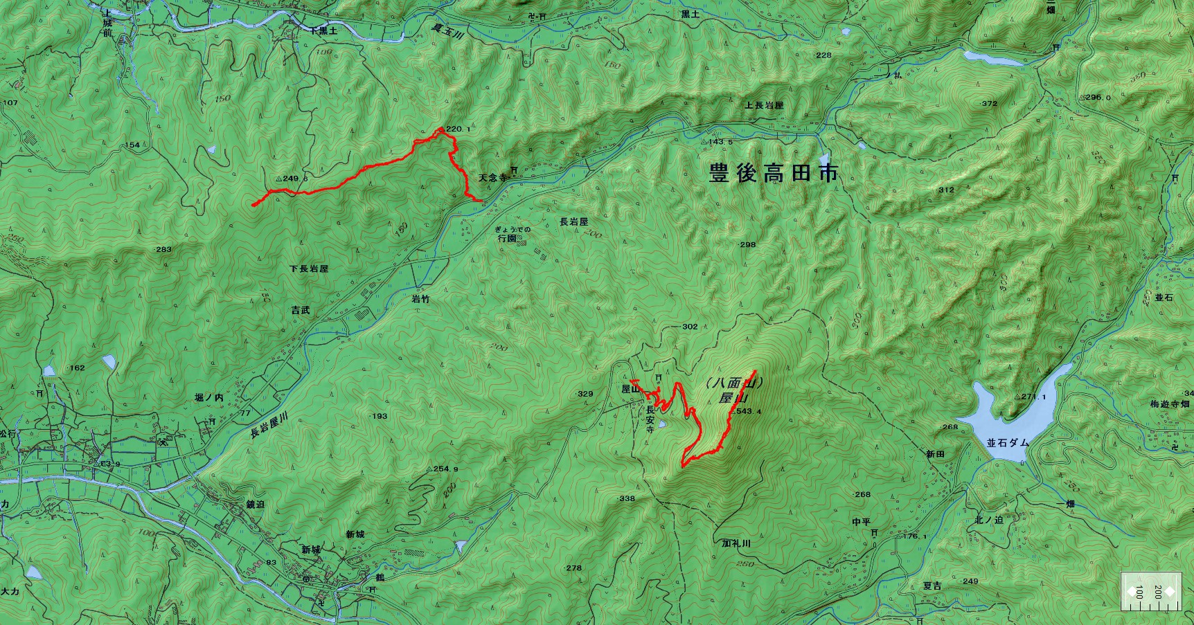 長岩屋・岩竹山/屋山登山コース(GPSによる歩行軌跡) 縮尺約 1/25000