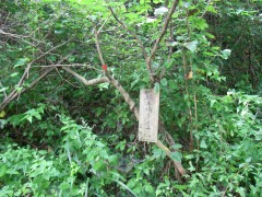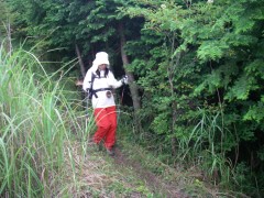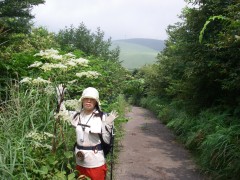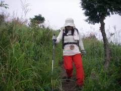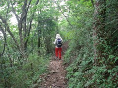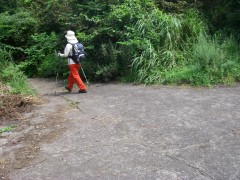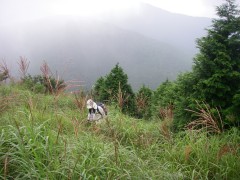 | 前ページから 山頂から城ケ岳を目指します。山頂に道標があるので進みます。しばらく稜線沿いに歩くと再び道票があります。今度は南に急斜面を降ります。かなりの勾配です。ところがカヤトに覆われ視界がなくなります。下れば降るほど背が高くなり、前が見えません。降りきった場所からしばらく悪戦苦闘しましたが、ここで断念することにしました。上り返して山頂で昼食としました。ガスの切れ間に城ケ岳が見えましたがいつ挑戦したいと思います。下山は山腹コースです。道票もしっかりとしてなだらかで歩きやすい道です。来た道を戻り、直登コースとの分岐を見て山腹コースへと進みます。すぐに植林帯との境を歩きやがて自然林の登山道となります。日影があって涼しい登山道です。いつのまにか北側の視界が開け晴れていれば湯布院の町や由布岳がみれたことでしょう。コース分岐点に着くと往路を下ります。 <参考コースタイム> 登山口−(17分)−コース分岐点−直登コース(60分)-山頂-(35分)山腹コース−コース分岐点-(10分)-登山口 ※休憩時間は含んでいません。あくまでも参考時間です。 今回は城ケ岳を目指し、途中まで行ったので駐車場に着いたのは12時50分でした。 <感想など> 倉木山の往復だけだと2時間程度なので、城ケ岳までと思いましたが、とにかくこの時期はカヤトで歩行困難です。ただ、ササコギの中、たくさんの珍しい花々が見れたのは、ご褒美だったのでしょうか。 山頂で中津から来られたご婦人から「ホームページを見てますよ」と言われ少々テレましたが、やっぱり山での出会は、いいものです。 後から合流したご主人と記念に写真でも撮れば良かったと下山途中で家内と話したものです。また、いつか、お会いしましょう。 |