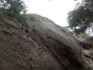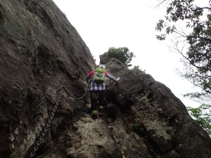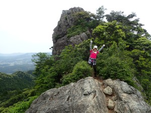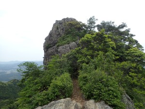 | 山頂へ | 石段がきつい | 岩壁の上が天童岩 |