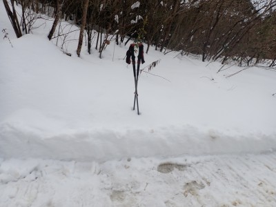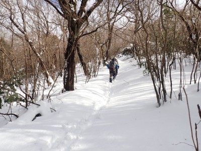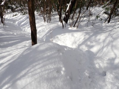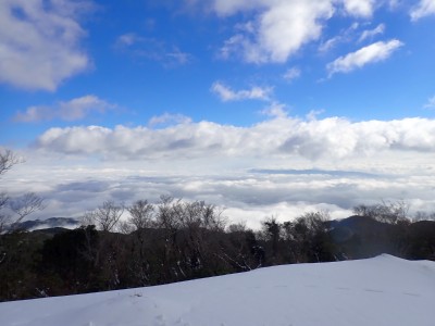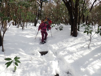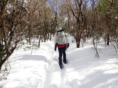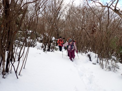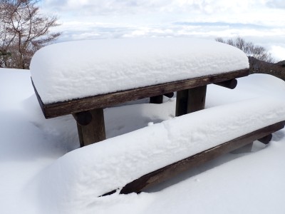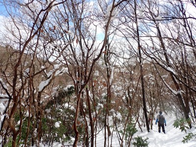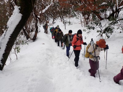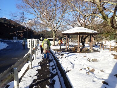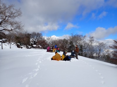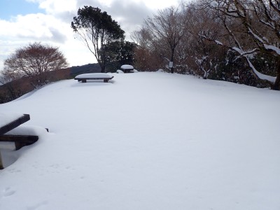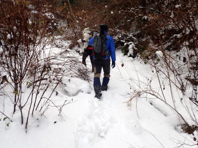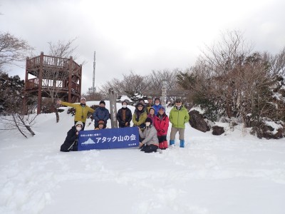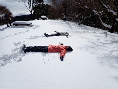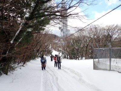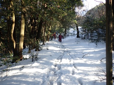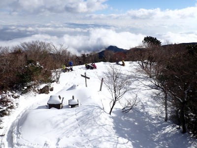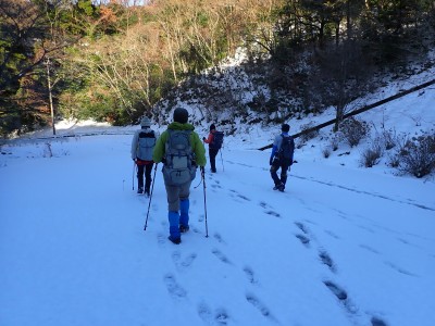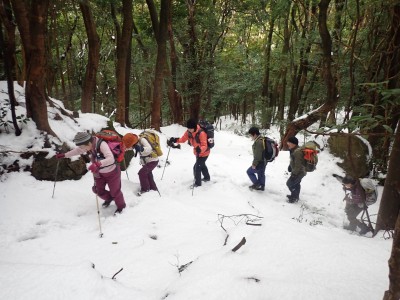 九州道は小倉東インターから入り、途中古賀SAでトイレ休憩して太宰府インターで降りた。住宅街の一般道をグリーンピア那珂川へと進む。山に近づくに連れ、雪がちらほら現れる。外気温は3度、道路の周りに除雪したと思われる雪が泥にまみれて盛り上がっている。グリーンピア那珂川への道みに入ろうとハンドル左に切ろうとしたが、そこは雪で私の車も底をついて進めそうにない。「いや〜スコップを積んでおけば良かった」と後悔。後続車で渋滞しそうだったのでその先で駐車スペースを探す。しかし私以外の車は冬用タイヤではない。進めば進むほど道路は凍結状態になってゆく。結局Uターンしてグリーンピア那珂川への曲がり口まで戻るとラッキーなことに除雪作業をしていた方達がいて何とか3台とも駐車場まで辿り着くことができた。ここまで来ればもう安心、この雪が楽しめると思うとはしゃがないわけにはいかない。皆も予想外の雪に笑顔であふれている。登山準備して出発。グリーンピアの施設内を過ぎ、当たり前だが登るにつれ雪は深くなって行く。微かなトレースはあるものの歩幅が合わないのでキックステップしてつぼ足ができるようにする。すぐに疲れて別の人と先頭を交代で歩く。新雪を楽しんで頂上の広場に着く。なんと足跡が全くない。なかなか味わえない光景だ。すぐに若手メンバーが雪遊びを始める。ランチタイムはいつもより多めに時間をとり、下山開始。往路を戻るが、雪は溶け始め結局アイゼンは使用しなかった。今年最後の山行はとても幸運でクリスマスらしい雪山であった。参加してくれたメンバーには本当に感謝である。