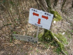 前ページからの続き 林道が右に大きくカーブする先端に登山口があります。(表示があります)私の持っているガイドブックとはかなり場所が違っていますが、おそらく林道工事が進んでルートが変わってきたのでしょう。ようやく登山道らしくなり、杉の植林帯をやや左に巻きながら高度を上げ、そして右に巻きながらさらに高度を上げると雁俣山との縦走路に出ます。左に進路をとりクマザサの登山道をしばらく東に歩くと石灰岩が現れます。ヤマシャクヤクやトリカブトが群生しています。さらに進むと木の間からに山頂が見えてきてクマザサの道を急登するとワナバ谷からの道と出合い、山頂にでます。このあたりはカタクリが多いようです。山頂は北側の展望が望めますが広くはありません。ちょうど12時となり(予定では山頂まで3時間みていましたが、2時間でこれました。)昼食としました。帰路は往路を戻ります。 |