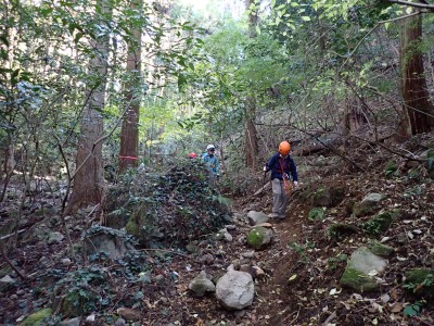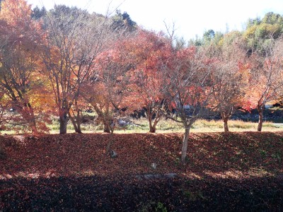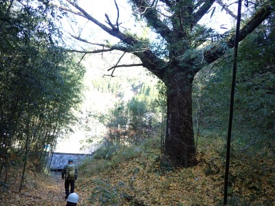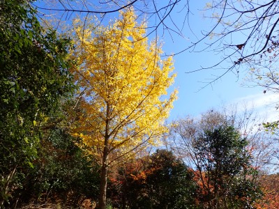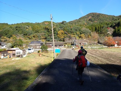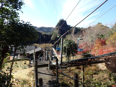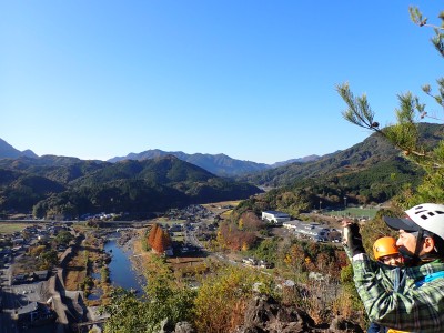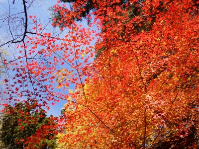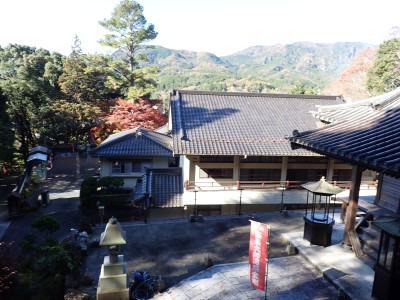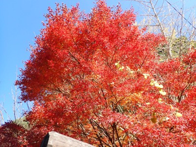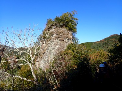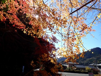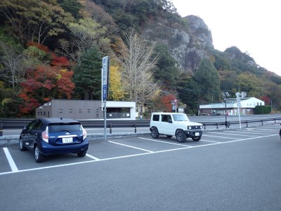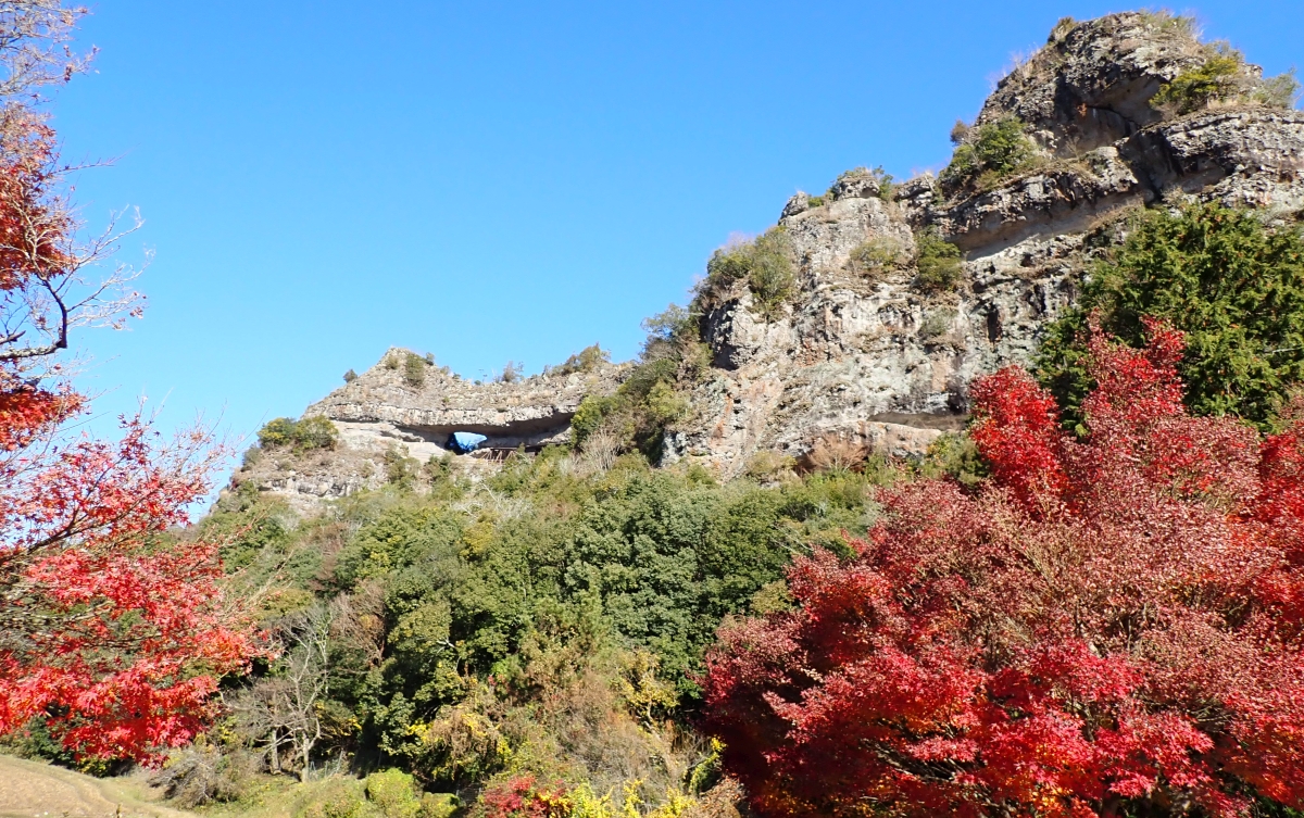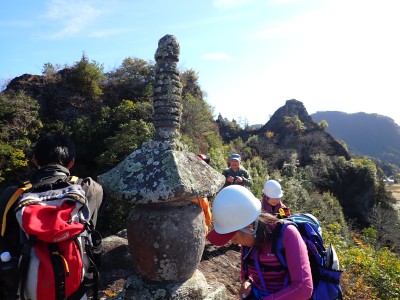 一ノ峰、二ノ峰、三ノ峰、恵比寿岩と案内板を見て進むが、どれがどれかよくわからず進み、鎖場では皆確保に集中し恐怖を全く抱くことなく無事通過。あっという間に弘法寺に到着した。ここから古羅漢まで九州自然歩道が繋がっているのだが、現在工事中で通行できないため一旦駐車場に戻り、車で移動する。古羅漢探勝道入り口前の駐車場に着くと青空に映えるもみじが見事でしばらく見とれていた。