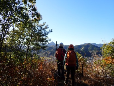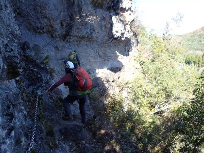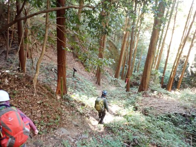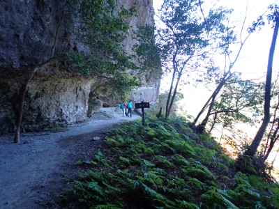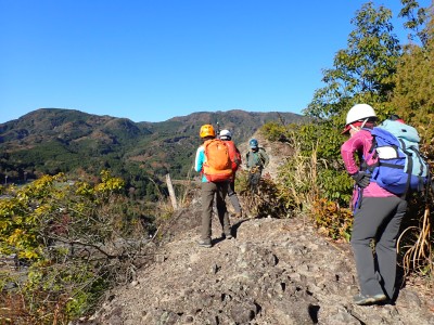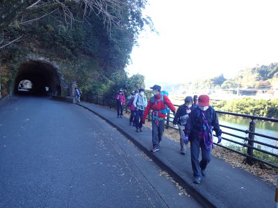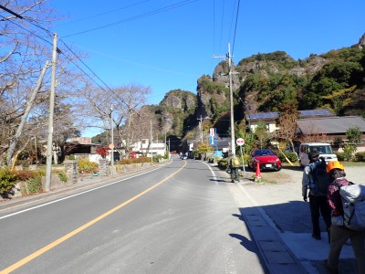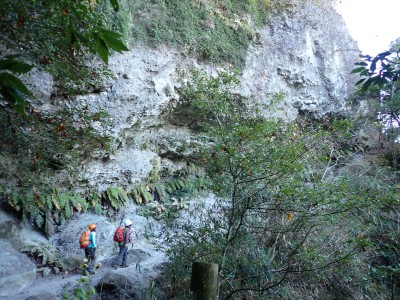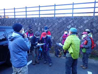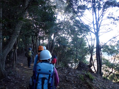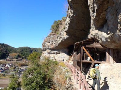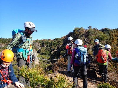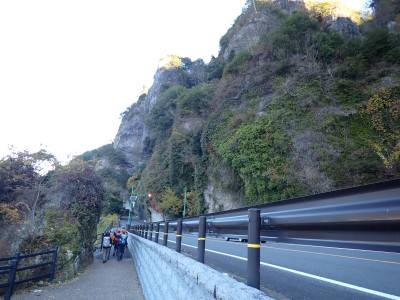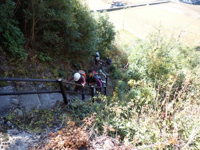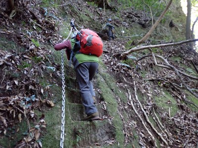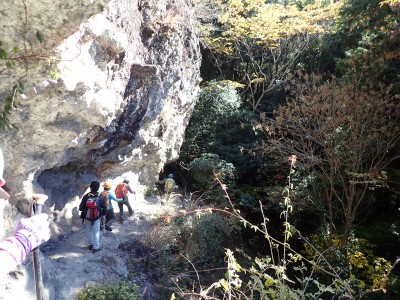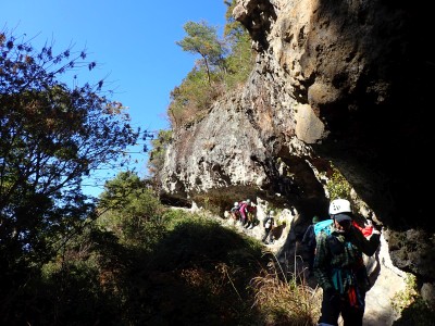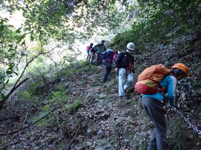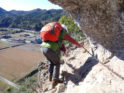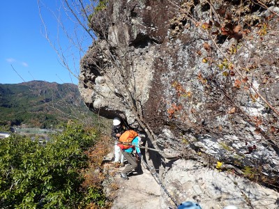 断崖絶壁には、岩壁を削って造った道があり、今回も一部そう言ったルートを行く。そこで安全第一の我が山の会は、傍から見るといかにもクライミングの格好となるのだが、安全確保のためヘルメットとスワミベルトを装着し、鎖にカラビナをかけて進む。そのため出発時は駐車場で説明と確認で時間をとっていたが、幸いにも好天で寒さもそれほどなく十分に時間がとれ、安全確認ができた。