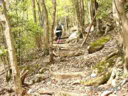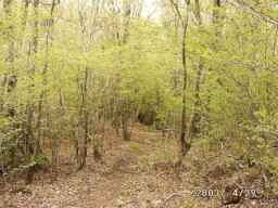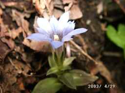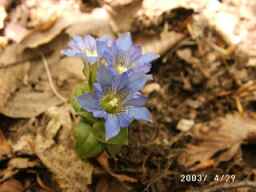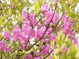 ここから急坂を行く、(この坂にフデリンドウがたくさんある)やがて尾根に出る。尾 根はやぶつばき、ミツバツツジが見られる。今日はミツバツツジが見事に満開だっ た。さらに山頂を目指し進む。一等三角点をみたらすぐに山頂に到着、ここからシ ャクナゲの群生が続く、まだ咲いてないだろうと尾根を行くとそれでもところどころ で花をみれた。