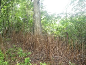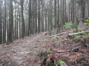 | ササが枯れている | 巨木が多い(赤いのが家内) | 道はなだらかだ |
