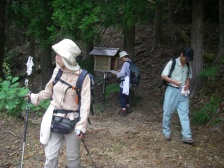山頂はガスで視界が利かなかったのですが、しばらく休憩をしているとガスが抜けてきました。下山はそのまま往路を下ります。 再び車に乗った我々は今度は石堂山を目指します。林道を分岐地点まで戻り、井戸内峠へと進みます。きれいに舗装された林道です。井戸内峠に着くと標識と説明板があります。注意事項などが書かれています。現在の標高が890mとあります。以前はここから私有地で鎖がかけられ車は入れなかったそうです。砂利の林道をしばらく行くと駐車できる広い場所に出ます。車はここに停めます。砂利道をさらに歩くと登山口です。登山届けも設置されていますので記入し、出発です。(午前10時)登山口から杉林の急登を歩き、やがて緩やかな上りとなります。15分程度でAコースとBコースと標識がある六合目に着きます。ここからは尾根伝いに歩きます。(ちなみに今回のコースはBコースらしい)西側の視界が開け市房山が望めます。急登に喘ぎ緩やかな道に出ると七合目は近くです。七合目を過ぎるとすぐに日の丸がある開けた場所に出ます。ここからは天包山が望めます。緩やかな道から急登すると林道に飛び出ます。林道を右手に進むと左手に登山道の標識があります。再び尾根歩きです。眺めは最高ですが、暑さが応えます。すぐに六合目です。一つ目のピークを喘ぎ登ると展望台とも言って良い岩があります。しばらく展望を楽しんだら再びピークを目指します。上りは続きます。さらにとヤセ尾根を進むと鎖場があり、最後の急登を喘ぐと山頂です。山頂は北側以外の展望が開けています。山頂で昼食を済ませ、下山は往路を下ります。途中で雨が降ってきました。 <参考コースタイム> 天包山⇒登山口−(5分)−坊主岩-(10分)-九合目-(17分)−山頂-(18分)登山口 ※休憩は含んでいません。休憩を入れても往復1時間程度です。 石堂山⇒登山口-(15分)-6合目−(60分)−林道出合-(40分)-九合目-(25分)-山頂−(40分)−林道出合−(50分)−登山口 ※休憩は含んでいません。全行程で約4.5時間でした。 |