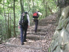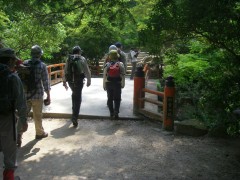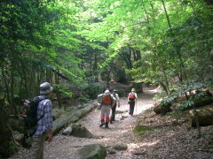 2009年5月31日 天気晴れ 7月の自然観察とボランティアの山の会の例会登山は、広島県は宮島の弥山の予定である。今日はその下見だ。宮島と言えば、世界遺産に登録されているのだが、厳島神社という文化遺産と前面の海、そして弥山原始林を始めとする自然遺産の複合遺産だということである。今日はその原始林の山を歩く。午前6時半、いつもように会に副代表の会社に集合し、出発。連絡船の発着場である宮島口に着いたのは午前9時。準備をして連絡船に乗り込む。メンバーは女性2人と男性5人の7名である。宮島観光案内⇒観光協会 <アクセス> 山陽道は大野I.Cより左折し、県道289号線から国道2号線を左折し、しばらく海沿いに走ると宮島口の標識がある。 <コース詳細> 連絡船で宮島渡ります。桟橋から厳島神社へ海沿いに歩きます。厳島神社を右に見てロープウエイ・もみじ谷公園の標識の通り進みます。公園の中を歩くと左に「もみぢ茶屋」を見て紅葉谷橋を渡り、トイレがある広場に出ます。ここでロープウエイ乗り場と登山口に分かれます。右に進路を取り、宮島案内図を見て階段状の道を歩きます。天然記念物である原始林の中を高度を上げ、途中、ベンチで休憩したりして標高約400mで獅子岩駅との分岐地点でもある稜線に出ます。なんとここからは、コンクリートの道となります。ロープウェイで獅子岩までこれるので観光客用の整備された道となります。右に山頂を目指します。巨岩が増え、景色も最高です。しばらく行くと求聞持堂に出ます。参拝して階段を上がると三鬼堂があって巨岩の中を歩くと展望台がある山頂に出ます。 (次ページへ) |