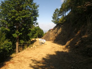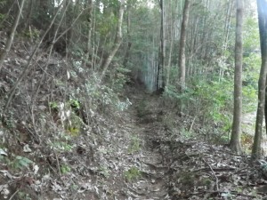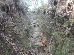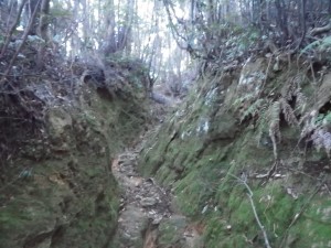 | 植林に囲まれる | 再びえぐれた道に | 粘土質で滑りやすい |