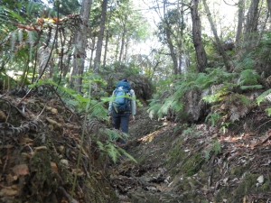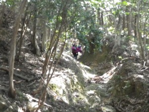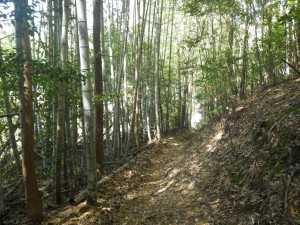 | 「九州百名山元越山」と大きな木柱 | 竹林から雑木林に | えぐられた登山道 |