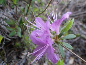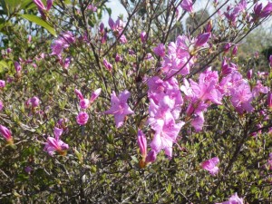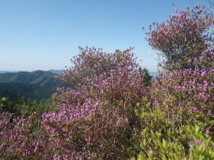 | 下山時に見たツツジ(おそらく園芸種) | 林道に出る | 下の地蔵付近からの展望(ドーム型の彦岳) |