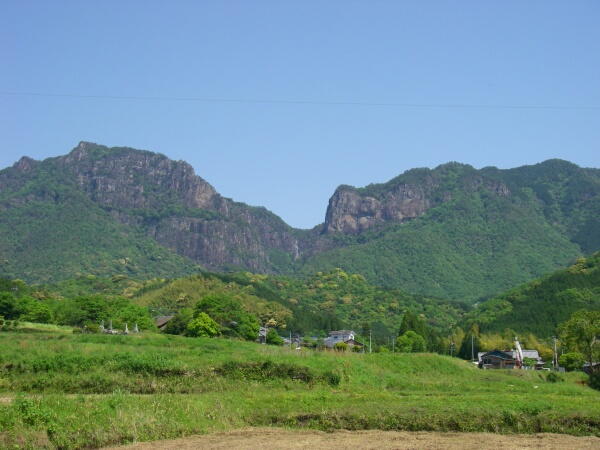 | 左が雄岳、右が雌岳 間に行縢の滝(矢筈の滝) | ||