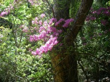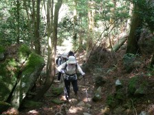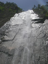 2008年5月3日(土) 天気晴れ 今年のGWはアケボノツツジを見たいということでMORIさんに計画してもらった。初日は宮崎県は行縢山(むかばき)、2日目は大崩山(三里河原)3日目は夏木山だ。午前6時、我が家を出発し、宇佐別府道から延岡市に入り登山口に着いたのはAM11時であった。 <アクセス> 延岡市内より五ケ瀬川沿いに国道218号線を高千穂方面へ平田町に標識があるので右折するとやがて行縢山の岩壁が見えてくる。 <コース詳細> 少年自然の家の先にバス亭があります。その先に駐車場(登山者用になっている)があります。神社の鳥居をくぐり参道を歩くと鳥居が見えます。その先に神社があります。手を合わせ無事下山できるように祈願し、鳥居手前を右斜めに進みます。大きな杉に驚き、しばらくすると頑丈そうな橋があり沢を渡ります。登山道は石が多くなり、再び橋があります。滝見橋です。ここから滝を見上げることができます。今まで見たことがない光景です。記念撮影をして巨岩群の山道を登り、左手に沢があるのでここで昼食をしました。5月にしては温度が高く、暑いので私はコンビニで買ったソーメンを食しました。沢とソーメン、結構、良い取り合わせです。昼食を済ませ出発です。すぐに滝との分岐があります。もちろん滝に立ち寄ります。(滝までは3分程度)滝の真下に来た私たちはその滝の高さに驚きです。神社の手前にあった説明板では幅約30m、高さ約76.6mとのこと。滝を十分楽しんだら分岐まで戻り、再び登山道を歩きます。階段を上りしばらくすると山の神峠です。左手に踏み跡があるので立ち寄ると素晴らしい展望が開けます。 峠を過ぎしばらくすると県民の森との分岐です。左手山頂を目指します。 次ページへ |