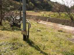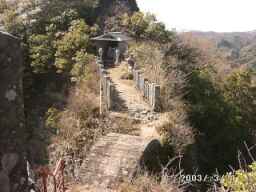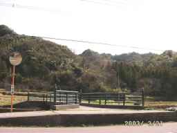 道路挟んで反対側に橋があります(写真)この橋を渡ってすぐに電柱?の下のほうに小さな標識があります(写真)すごくわかりにくいので 注意してください。標識のとおりまっすぐ進むと山の中に入っていきます。