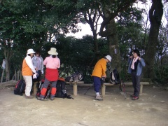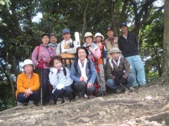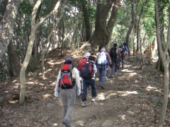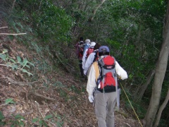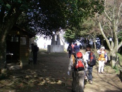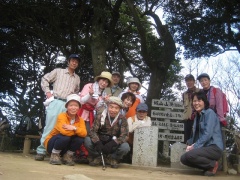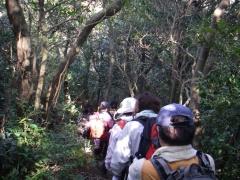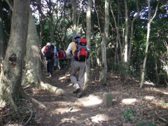 2010年3月14日 曇り 遊山歩の3月例会登山は、近場で低山ではあるが宗像の四つの山を縦走する結構きついコースである。いや私は未体験なのでどれだけきついかはわからない。ただ、地形図を見る限り、アップダウンの標高差はかなりのもんだ。 以前、金山以外はそれぞれ単独で歩いたことはあったが、まさか縦走することになるとは思ってもみなかった。参加者はMORIさん夫妻、信ちゃん&俊ちゃん夫妻、あずきさん、フクロウさん、あこちゃん、そして案内をしてくれたはまちゃんとむさしさんと私たち夫婦の11名となった。 AM8時00分、集合場所である湯川山の成田山不動寺には、集合時間の30分前ではあるが、全員集まり、車を2台置き、城山登山口へと移動する。 <コース詳細> 岡垣町上畑にある荒平神社の駐車場より車道を歩き敷島大稲荷神社から参道を上ります。上宮があって登山道となり、高度を上げて行きます。自然林の気持ちの良いコースです。山頂まで300mの道標を見て急斜面を喘ぐと城山(じょうやま)山頂です。山頂は灯篭や記念碑があって南は古処山や馬見山、北はこれから歩く峰々や玄海灘が望めます。展望を楽しんだら金山(かなやま)を目指し、北に進路をとります。急斜面をくだり鞍部に出ると石峠です。一息ついて再び上り返します。自然林が続き、ジグザクな道を登り詰め金山南岳に出ます。宗像の街を眺め再び縦走路を歩きます。しばらくすると前方に孔大寺山(こだいじやま)が見える金山北岳に着きます。ここから右(東)に折れ下りとなり車道に出ると地蔵峠です。きれいな舗装道です。高度計は130mとなっていました。孔大寺山への登山口は車道の反対にあります。休憩をして孔大寺山を目指し、上り始めます。自然林は続きます。白山の分岐を過ぎ、梛野の分岐を見て孔大寺山山頂です。展望はありません。今回はここで昼食です。先客の皆さんが場所を譲ってくれてゆっくりと食事を楽しむことができました。(感謝!)次ページへ |