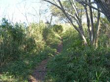 | 橋を渡り左手に | 今回のコース 登山口から林道を行くとすぐ左手の標識に沿って池を巻くように進みます。竹林を抜けヒノキ林となり沢沿いに行くと一旦沢を横切り徐々に急登となり、次第にロープを頼りになるほど急登となります。植林を抜けるとすぐに山頂に出ます。山頂は360度の展望です。帰路は往路ですが、下りは滑りやすいので慎重に・・・ ちなみに「六ガ岳」は「朝日岳」を指します。 コースタイム 内野池登山口−(30分)−山頂−(25分)−内野池 ※約1時間(休憩なし) 注意 往復1時間のコースですが、急登で滑りやすいため、上りよりも下りに注意がいります。 |