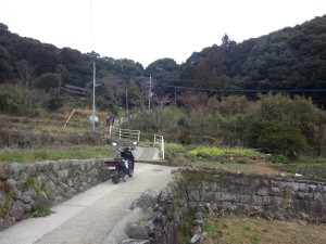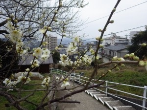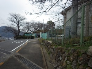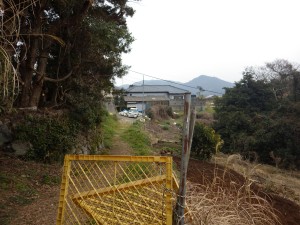 | 民家の中の細い坂道を歩く | 梅の花が咲いていた | 山がV字になっているところまで進む |