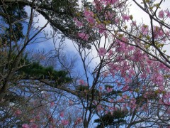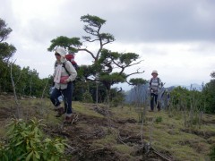 2009年5月6日 天気晴れ 昨日は尾鈴山を満喫し、下山後、藤川内渓谷を通り夏木林道で犬流れ登山口の先の駐車スペースでキャンプとなった。(車上泊)予定では犬流れ登山口から鋸尾根を歩く予定であったが登山口に「崩落のため通行禁止」と書かれていて急遽夏木新道を歩くことにした。翌朝、夏木新道登山口に行くと何とこの連休の4月29日に崩落のため通行止めと書かれていてほんのつい最近の話であることがわかった。※昨日の尾鈴山の記録へ AM5時に起床、食事を済ませ、登山口へ移動。AM6時40分登山開始。 参加者は昨日同様、MORIさん夫妻、豊津の信ちゃん&俊ちゃん、そして私たち夫婦の6名での山行だ。 <コース詳細> 登山届を記帳して登山道に入りますが、最初から手を着くほどの急登です。尾根に取り付いてさらに急登します。赤松が目につきます。約15分で平らな道となりヒメシャラやシャクナゲが多くなります。再び急斜面となり登山口から約50分であけぼの平です。右手に鋸尾根が見えてきます。休憩してさらに急斜面を歩きます。岩が多くなり両手両足を使っての上りが増えます。アケボノツツジも多くなります。あけぼの平から約40分で大きな平な石の船石着き、すぐに稜線に出ます。犬流れ側の通行止めの表示を見て左手(南)に進みます。岩をよじ登り20分程度で夏木山山頂です。山頂からは北側の鋸尾根や傾山が遠くに見えます。少し腹ごしらえをして次は五葉岳を目指します。大きな岩場を下り、アップダウンしながら爽やかな稜線歩きをします。やがて目の前に五葉岳が見えてきます。登山道はそこで右におおきく回り込みます。(五葉岳が目の前にあるからと言って真っ直ぐ入り込むと藪こぎになります)少し下ると兜巾山との分岐に出て左側(南)へ進みます。平坦な道しばらく歩きます。と大吹峠への分岐表示を見て上り道となり巨岩が現れ登りきると五葉岳山頂です。岩の狭い山頂ですが360度の展望が最高です。(次ページへ) |